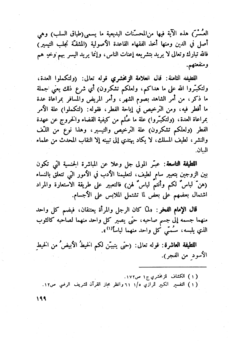 اللطيفة الثامنة: قال العلامة الزمخشري قوله تعالى: {وَلِتُكْمِلُواْ العدة وَلِتُكَبِّرُواْ الله على مَا هَدَاكُمْ وَلَعَلَّكُمْ تَشْكُرُونَ} أي شرع ذلك يعني جملة ما ذكر، من أمر الشاهد بصوم الشهر، وأم المريض والمسافر بمراعاة عدة ما أفطر فيه، ومن الترخيص في إباحة الفطر، فقوله: {وَلِتُكْمِلُواْ} علة الأمر بمراعاة العدة، (ولتكبّروا) علة ما عُلم من كيفية القضاء والخروج عن عهدة الفطر {وَلَعَلَّكُمْ تَشْكُرُونَ} علة الترخيص والتيسير، وهذا نوع من اللّف والنشر، لطيف المسلك، لا يكاد يهتدي إلى تبينه إلا النقاب المحدث من علماء البيان.