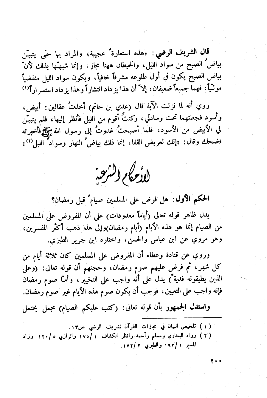 قال الشريف الرضي: «هذه استعارةٌ عجيبة، والمراد بها حتى يتبيّن بياضُ الصبحُ من سواد الليل، والخيطان هاهنا مجاز، وإنما شبّهها بذلك لأنّ بياض الصبح يكون في أول طلوعه مشرقاً خافياً، ويكون سواد الليل منقضياً موليّاً، فهما جميعاً ضعيفان، إلاّ أن هذا يزداد انتشاراً وهذا يزداد استسراراً» .