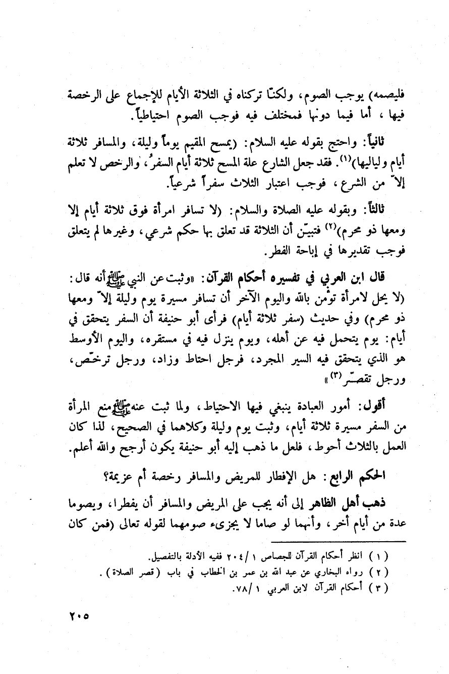 قال ابن العربي في تفسيره «أحكام القرآن» : «وثبت عن النبي صَلَّى اللَّهُ عَلَيْهِ وَسَلَّم َ أنه قال:» لا يحل لامرأة تؤمن بالله واليوم الآخر أن تسافر مسيرة يوم وليلة إلاّ ومعها ذو محرم «وفي حديث (سفر ثلاثة أيام) فرأى أبو حنيفة أن السفر يتحقق في أيام: يوم يتحمل فيه عن أهله، ويوم ينزل فيه في مستقره، واليوم الأوسط هو الذي يتحقق فيه السير المجرد، فرجل احتاط وزاد، ورجل ترخّص، ورجل تقصّر» .