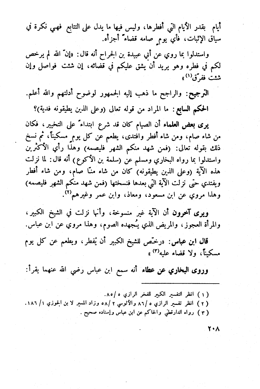 قال ابن عباس: (رخّص للشيخ الكبير أن يفطر، ويطعم عن كل يوم مسكيناً، ولا قضاء عليه) .