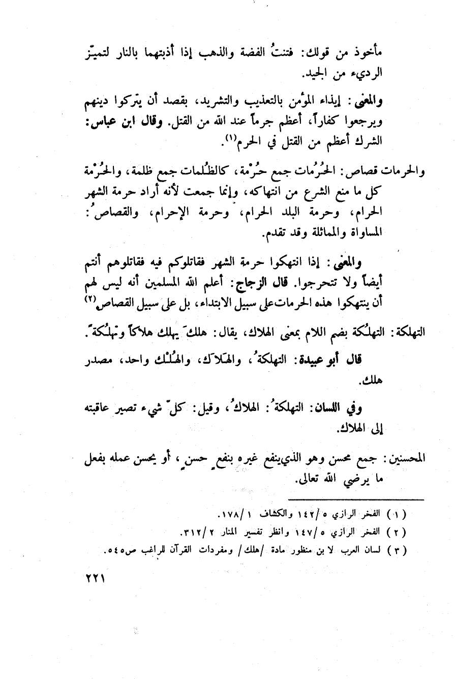 وفي اللسان: التهلكةُ: الهلاكُ، وقيل: كلّ شيء تصير عاقبته إلى الهلاك.