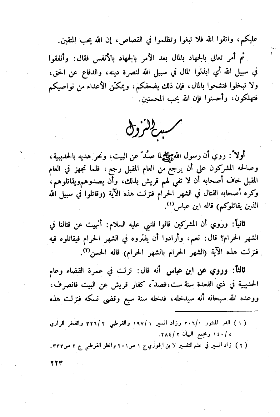 أولاً: روي أن رسول الله صَلَّى اللَّهُ عَلَيْهِ وَسَلَّم َ لما صُدّ عن البيت، ونحر هديه بالحديبية، وصالحه المشركون على ان يرجع من العام المقبل رجع، فلما تجهز في العام المقبل خاف أصحابه أن لا تفي لهم قريش بذلك، وأن يصدوهم ويقاتلوهم، وكره أصحابه القتال في الشهر الحرام فنزلت هذه الآية {وَقَاتِلُواْ فِي سَبِيلِ الله الذين يُقَاتِلُونَكُمْ} قاله ابن عباس.
