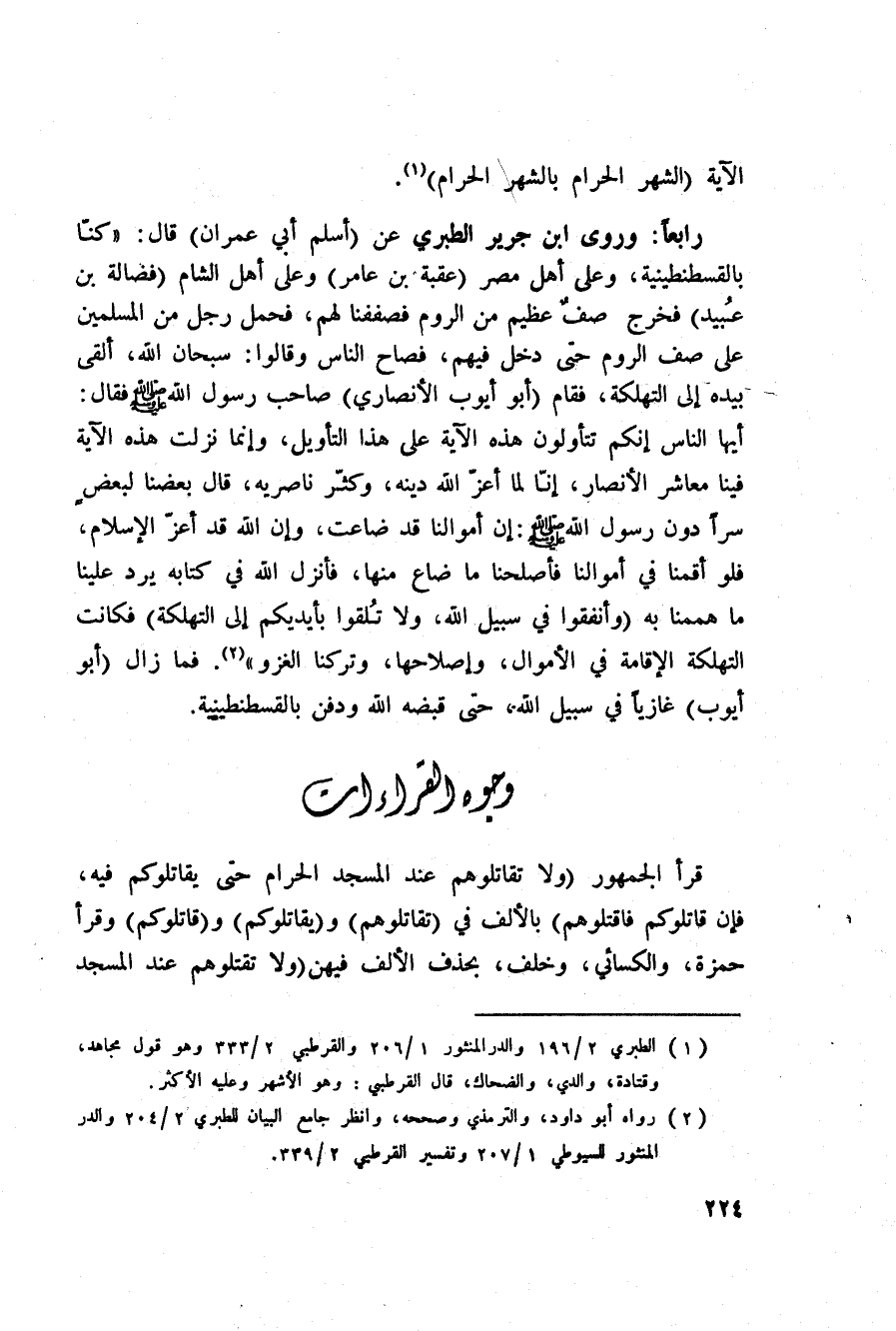 رابعاً: وروى ابن جرير الطبري: عن (أسلم أبي عمران) قال: «كنا بالقسطنطينية، وعلى أهل مصر (عقبة بن عامر) وعلى أهل الشام (فضالة بن عُبيد) فخرج صفٌ عظيم من الروم فصففنا لهم، فحمل رجل من المسلمين على صف الروم حتى دخل فيهم، فصاح الناس وقالوا: سبحان الله، ألقى بيده إلى التهلكة، فقام (أبو أيوب الأنصاري) صاحب رسول الله صَلَّى اللَّهُ عَلَيْهِ وَسَلَّم َ فقال: أيها الناس إنكم تتأولون هذه الآية على هذا التأويل، وإنما نزلت هذه الآية فينا معاشر الأنصار، إنّا لما أعزّ الله دينه، وكثّر ناصريه، قال بعضنا لبعضٍ سراً دون رسول الله صَلَّى اللَّهُ عَلَيْهِ وَسَلَّم َ: إن أموالنا قد ضاعت، وإن الله قد أعزّ الإسلام، فلو أقمنا في أموالنا فأصلحنا ما ضاع منها، فأنزل الله في كتابه يرد علينا ما هممنا به {وَأَنْفِقُواْ فِي سَبِيلِ الله وَلاَ تُلْقُواْ بِأَيْدِيكُمْ إِلَى التهلكة} فكانت التهلكة الإقامة في الأموال، وإصلاحها، وتركنا الغزو» فما زال (أبو أيوب) غازياً في سبيل الله، حتى قبضه الله ودفن بالقسطنطينية.