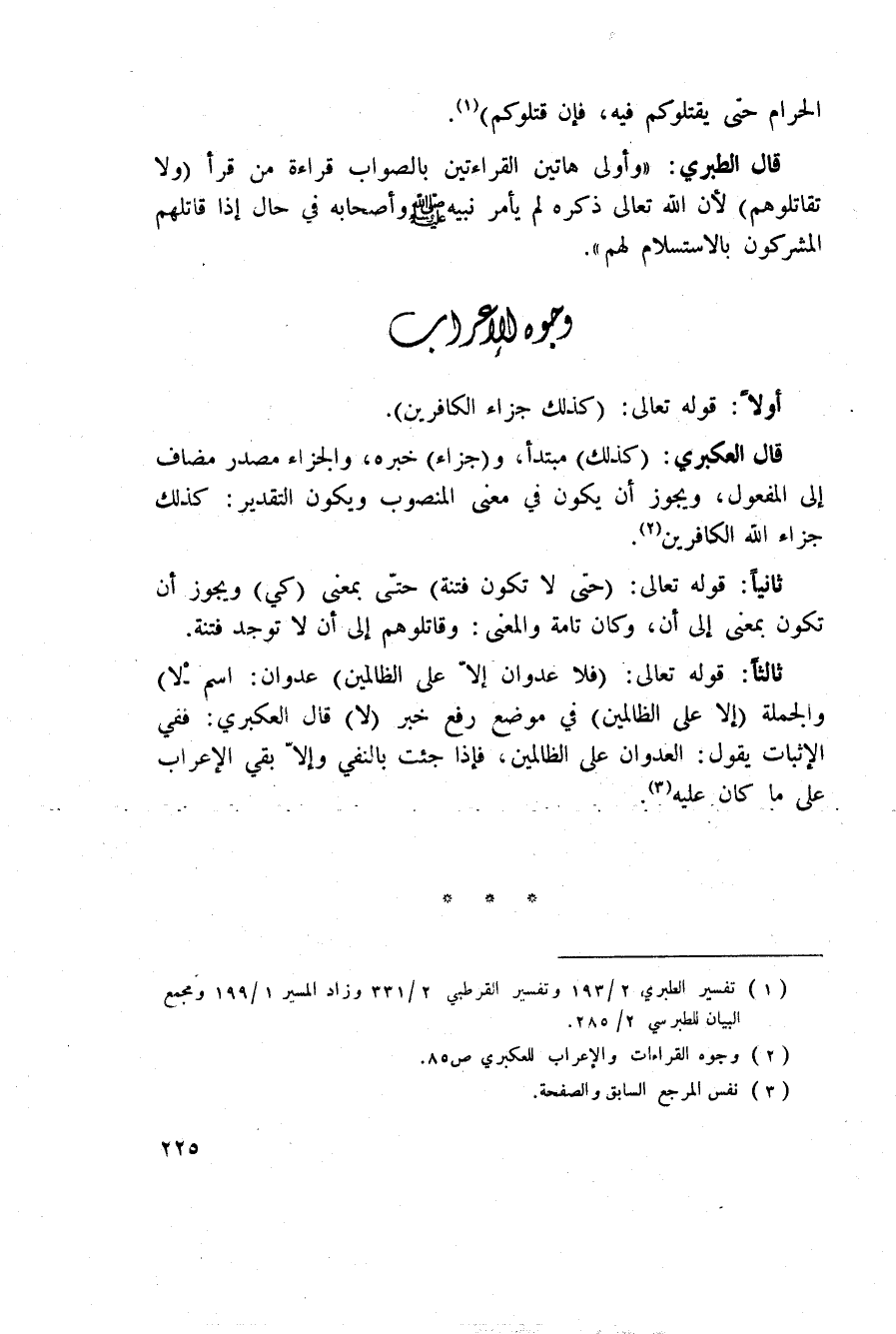 قال الطبري: «وأولى هاتين القراءتين بالصواب قراءة من قرأ (ولا تقاتلوهم) لأن الله تعالى ذكره لم يأمر نبيه صَلَّى اللَّهُ عَلَيْهِ وَسَلَّم َ وأصحابه في حال إذا قاتلهم المشركون بالاستسلام لهم» .