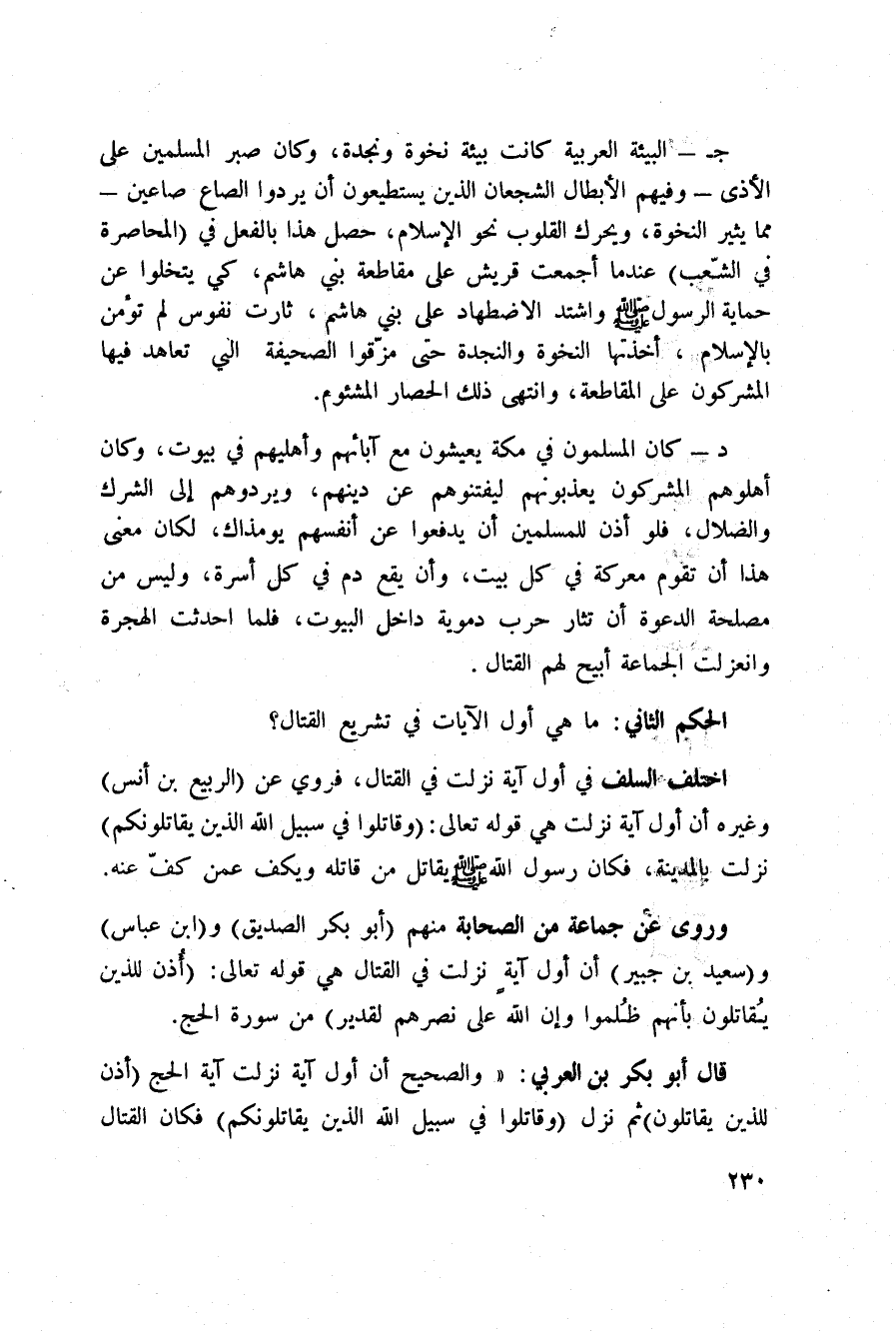 د - كان المسلمون في مكة يعيشون مع آبائهم وأهليهم في بيوت، وكان أهلوهم المشركون يعذبونهم ليفتنوهم عن دينهم، ويردوهم إلى الشرك والضلال، فلو أذن للمسلمين أن يدفعوا عن أنفسهم يومذاك، لكان معنى هذا أن تقوم معركة في كل بيت، وأن يقع دم في كل أسرة، وليس من مصلحة الدعوة أن تثار حرب دموية داخل البيوت، فلما أحدثت الهجرة وانعزلت الجماعة أبيح لهم القتال.