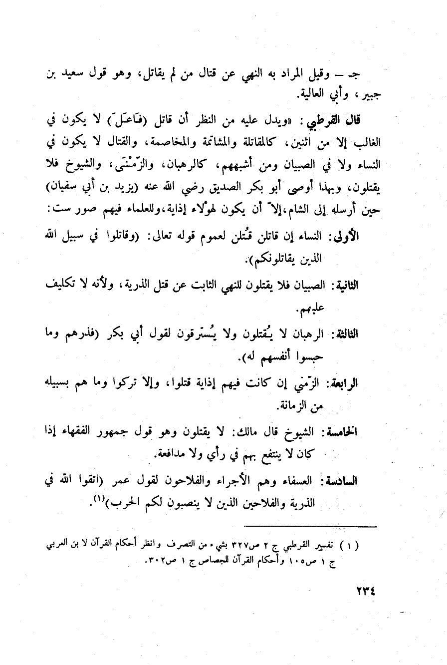 قال القرطبي:» ويدل عليه من النظر أن قاتل (فَاعَلَ) لا يكون في الغالب إلا من اثنين، كالمقاتلة والمشاتمة، والمخاصمة، والقتال لا يكون في النساء ولا في الصبيان ومن أشبههم، كالرهبان، والزّمْنَى، والشيوخ فلا يقتلون، وبهذا أوصى أبو بكر الصديق رَضِيَ اللَّهُ عَنْه (يزيد ابن أبي سفيان) حين أرسله إلى الشام، إلاّ أن يكون لهؤلاء إذاية، وللعلماء فيهم صور ست:
