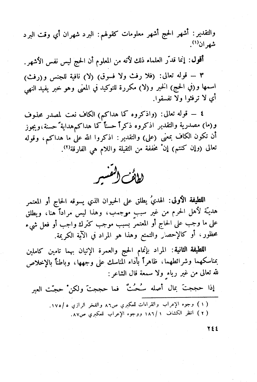اللطيفة الثانية: المراد بإتمام الحج والعمرة الإتيان بهما تامين كاملين بمناسكهما وشرائطهما ظاهراً بأداء المناسك على وجهها، وباطناً بالإخلاص لله تعالى من غير رياءٍ ولا سمعة قال الشاعر: