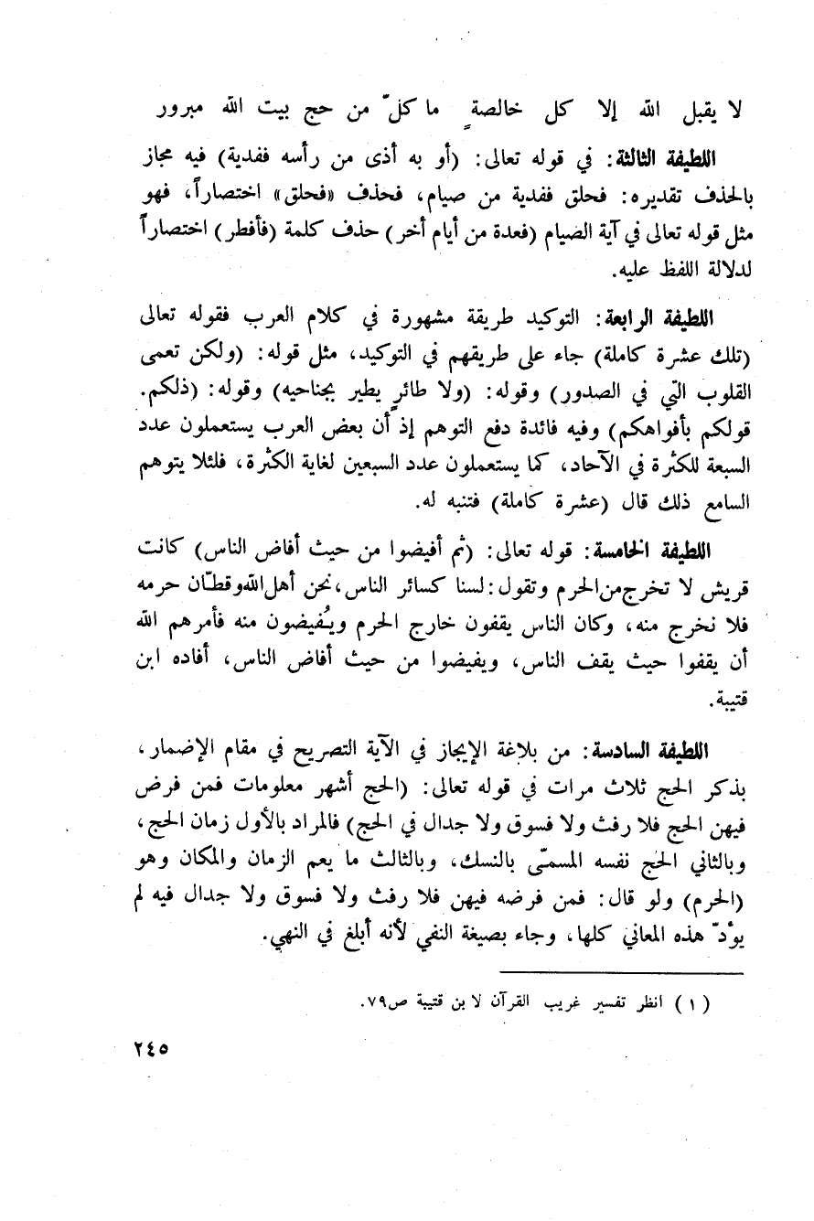 اللطيفة السادسة: من بلاغة الإيجاز في الآية التصريح في مقام الإضمار، بذكر الحج ثلاث مرات في قوله تعالى: {الحج أَشْهُرٌ مَّعْلُومَاتٌ فَمَن فَرَضَ فِيهِنَّ الحج فَلاَ رَفَثَ وَلاَ فُسُوقَ وَلاَ جِدَالَ فِي الحج} فالمراد بالأول زمان الحج، وبالثاني الحج نفسه المسمّى بالنسك، وبالثالث ما يعم الزمان والمكان وهو (الحرم) ولو قال: فمن فرضه فيهن فلا رفث ولا فسوق ولا جدال فيه، لم يؤدّ هذه المعاني كلها، وجاء بصيغة النفي لأنه أبلغ في النهي.