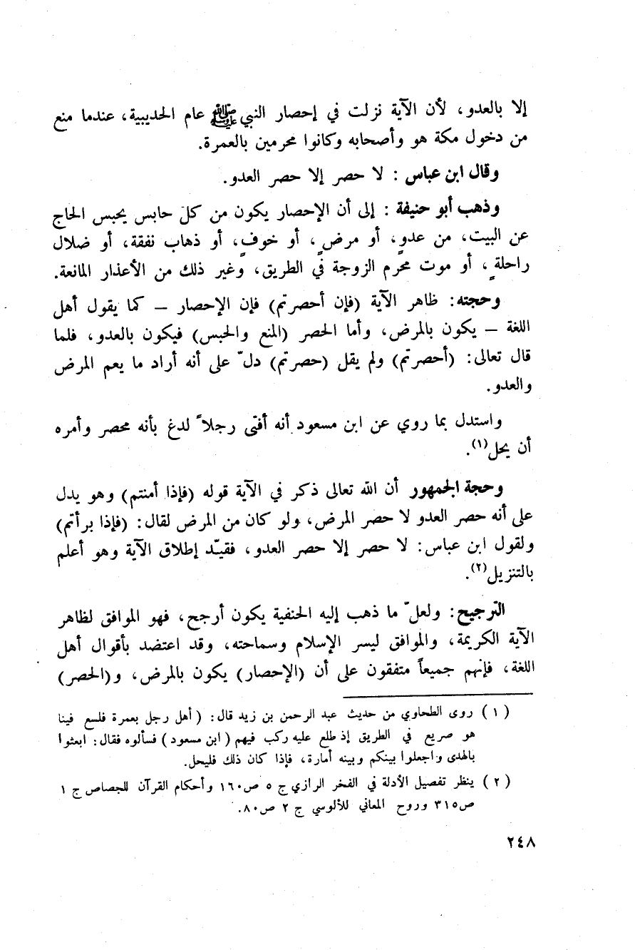 الترجيح: ولعلّ ما ذهب إليه الحنفية يكون أرجح، فهو الموافق لظاهر الآية الكريمة، والموافق ليسر الإسلام وسماحته، وقد اعتضد بأقوال أهل اللغة، فإنهم جميعاً متفقون على أن (الإحصار) يكون بالمرض، و (الحصر)