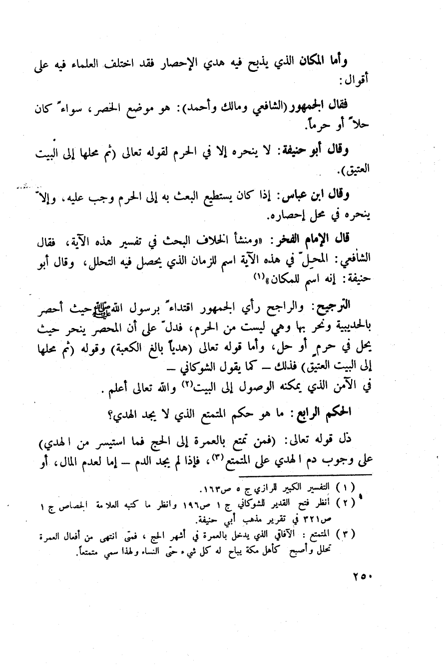 قال الإمام الفخر: «ومنشأ الخلاف البحث في تفسير هذه الآية، فقال الشافعي: المحِلّ في هذه الآية اسم للزمان الذي يحصل فيه التحلل، وقال أبو حنيفة: إنه اسم للمكان» .