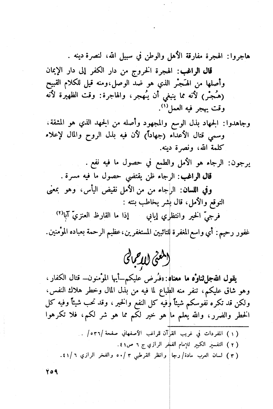 يقول الله جل ثناؤه ما معناه: «فُرض عليكم - أيها المؤمنون - قتال الكفار، وهو شاق عليكم، تنفر منه الطباع لما فيه من بذل المال وخطر هلال النفس، ولكن قد تكره نفوسكم شيئاً وفيه كل النفع والخير، وقد تحب شيئاً وفيه كل الخطر والضرر، والله يعلم ما هو خير لكم مما هو شر لكم، فلا تكرهوا