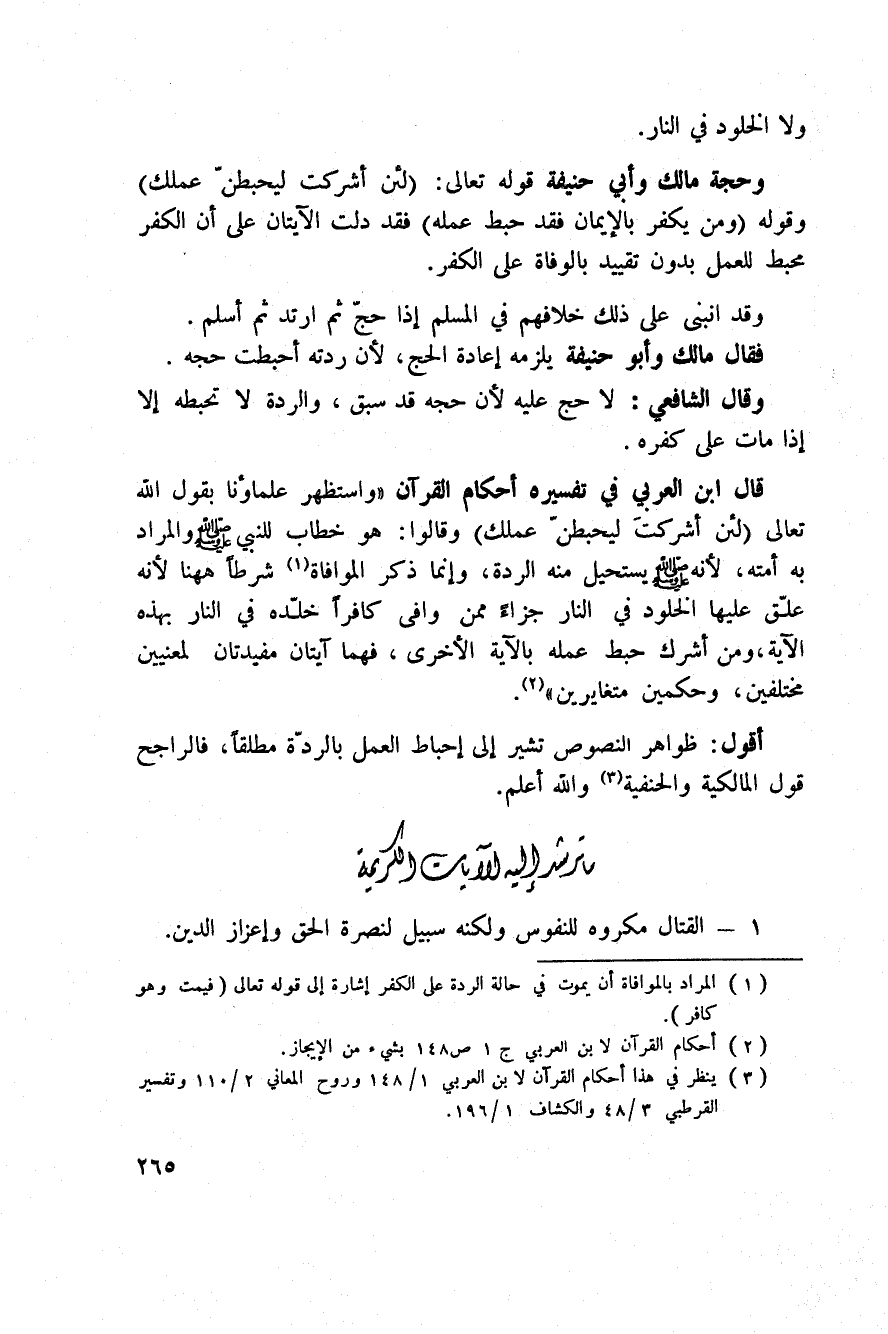 قال ابن العربي في تفسيره «أحكام القرآن» : «واستظهر علماؤنا بقول الله تعالى: {لَئِنْ أَشْرَكْتَ لَيَحْبَطَنَّ عَمَلُكَ} [الزمر: 65] وقالوا: هو خطاب للنبي صَلَّى اللَّهُ عَلَيْهِ وَسَلَّم َ والمراد به أمته، لأنه صَلَّى اللَّهُ عَلَيْهِ وَسَلَّم َ يستحيل منه الردة، وإنما ذكر الموافاة، شرطاً هاهنا لأنه علّق عليها الخلود في النار جزاءً ممن وافى كافراً خلّده في النار بهذه الآية، ومن أشرك حبط عمله بالآية الأخرى، فهما آيتان مفيدتان لمعنيين مختلفين، وحكمين متغايرين» .