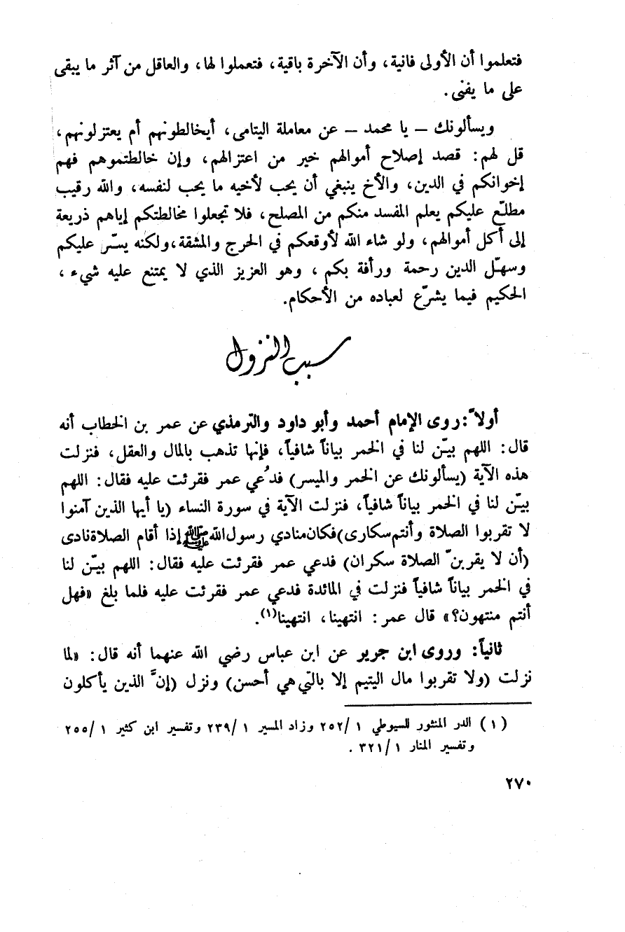 أولاً: روى الإمام أحمد وأبو داود والترمذي عن عمر بن الخطاب أنه قال: اللهم بيّن لنا في الخمر بياناً شافياً، فإنها تذهب بالمال والعقل، فنزلت هذه الآية {يَسْأَلُونَكَ عَنِ الخمر والميسر} فُدعي عمر فقرئت عليه فقال: اللهم بيّن لنا في الخمر بياناً شافياً، فنزلت الآية في سورة النساء [43] {يَا أَيُّهَا الذين آمَنُواْ لاَ تَقْرَبُواْ الصلاوة وَأَنْتُمْ سكارى} فكان منادي رسول الله صَلَّى اللَّهُ عَلَيْهِ وَسَلَّم َ إذا أقام الصلاة نادى: أن لا يقربنّ الصلاة سكران، فدعي عمر فقرئت عليه فقال: اللهم بيّن لنا في الخمر بياناً شافياً فنزلت في المائدة، فدعي عمر فقرئت عليه فلما بلغ {فَهَلْ أَنْتُمْ مُّنتَهُونَ} [المائدة: 91] قال عمر: انتهينا، انتهينا.