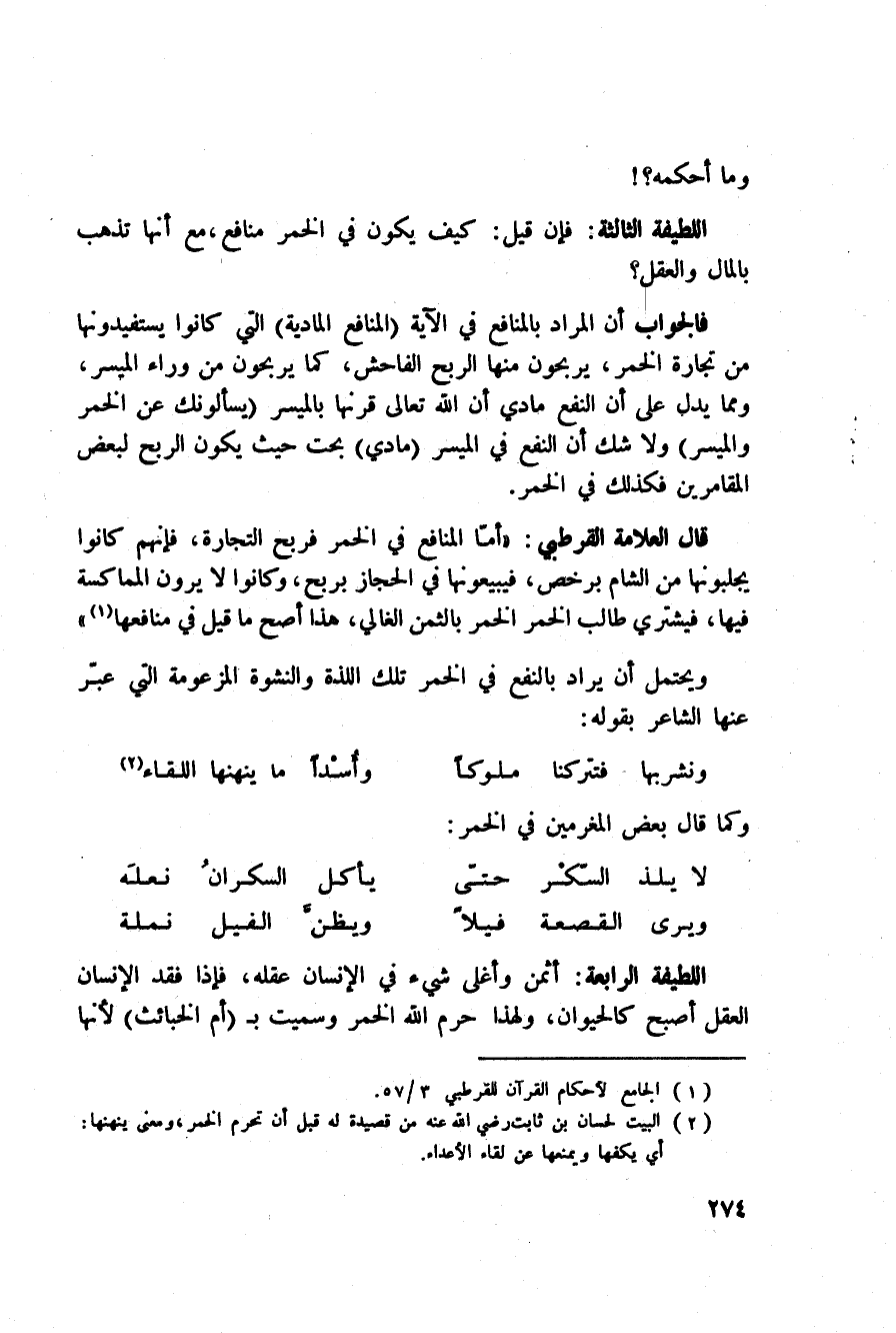 ويحتمل أن يراد النفع في الخمر تلك اللذة والنشوة المزعومة التي عبرّ عنها الشاعر بقوله: