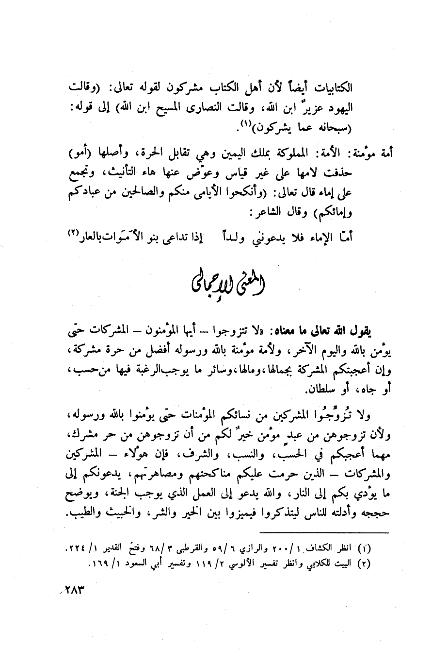 يقول الله تعالى ما معناه: لا تتزوجوا - أيها المؤمنون - المشركات حتى يؤمن بالله واليوم الآخر، ولأمة مؤمنة بالله ورسوله أفضل من حرة مشركة، وإن أعجبتكم المشركة بجمالها، ومالها، وسائر ما يوجب الرغبة فيها من حسب، أو جاه، أو سلطان.