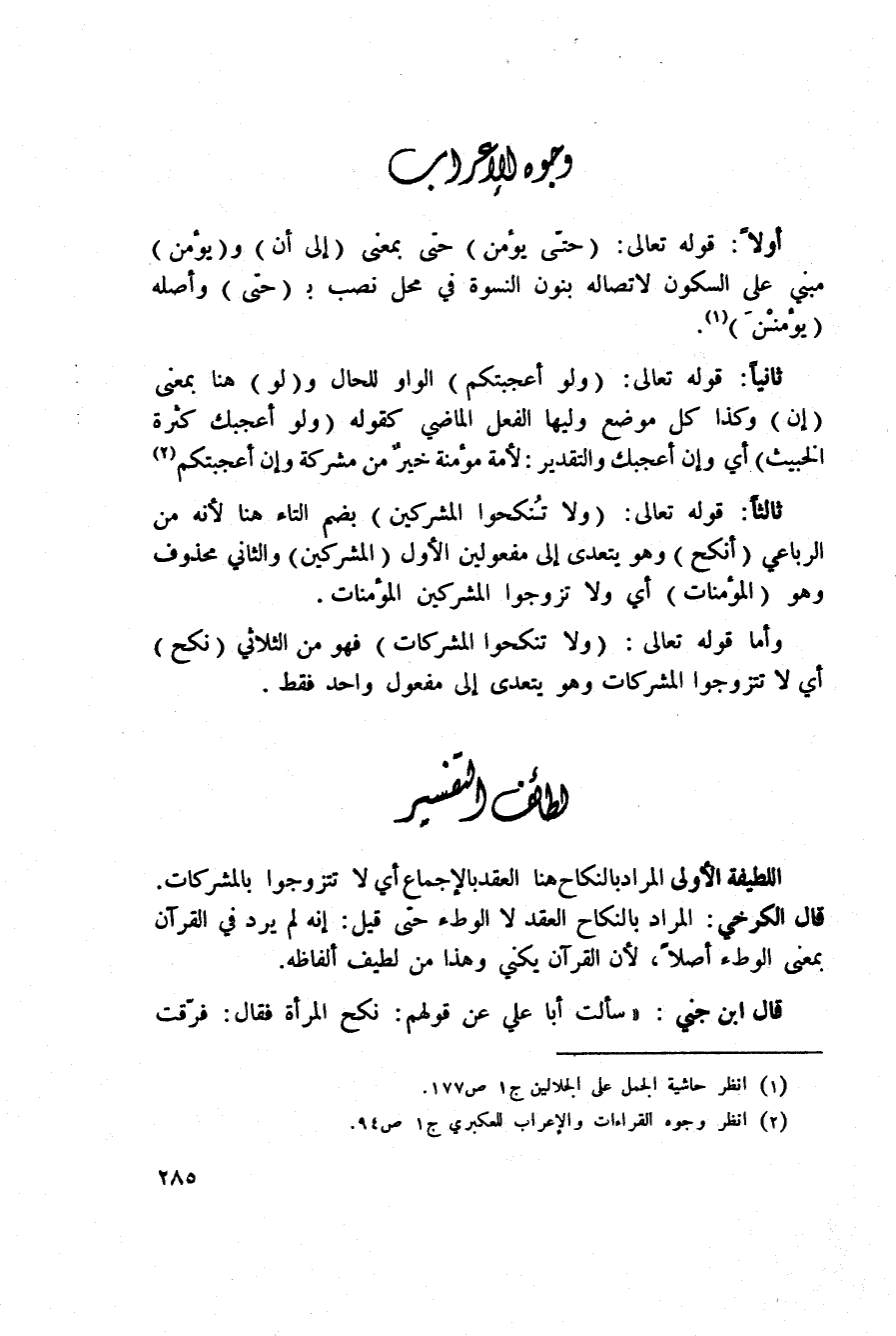 ثانياً: قوله تعالى: {وَلَوْ أَعْجَبَتْكُمْ} الواو للحالو (لو) هنا بمعنى (إن) وكذا كل موضع وليها الفعل الماضي كقوله: {وَلَوْ أَعْجَبَكَ كَثْرَةُ الخبيث} [المائدة: 100] أي وإن أعجبك والتقدير: لأمة مؤمنة خيرٌ من مشركة وإن أعجبتك.