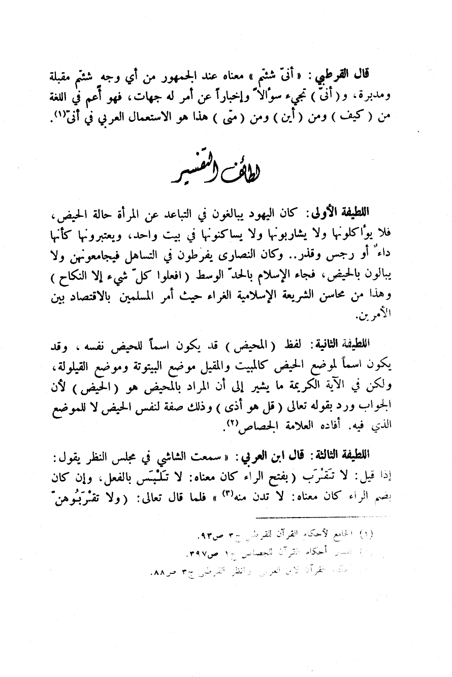 اللطيفة الأولى: كان اليهود يبالغون في التباعد عن المرأة حالة الحيض، فلا يؤاكلونها ولا يشاربونها ولا يساكنونها في بيت واحد، ويعتبرونها كأنها داءٌ أو رجس وقذر، وكان النصارى يفرطون في التساهل فيجامعونهن ولا يبالون بالحيض، فجاء الإسلام بالحدّ الوسط (افعلوا كلّ شيء إلا النكاح) وهذا من محاسن الشريعة الإسلامية الغراء حيث أمر المسلمين بالاقتصاد بين الأمرين.