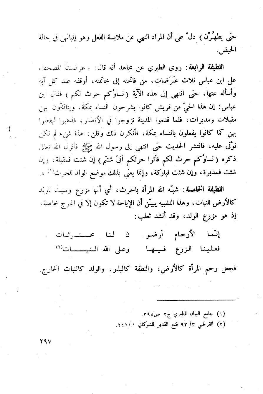 اللطيفة الرابعة: روى الطبري عن مجاهد أنه قال: «عرضتُ المصحف على ابن عباس ثلاث عَرَضات، من فاتحته إلى خاتمته أوقفه عند كل آية وأسأله عنها، حتى انتهى إلى هذه الآية {نِسَآؤُكُمْ حَرْثٌ لَّكُمْ فَأْتُواْ حَرْثَكُمْ أنى شِئْتُمْ} فقال ابن عباس: إن هذا الحيّ من قريش كانوا يشرحون النساء بمكة، ويتلذّذون بهن مقبلات ومدبرات، فلمّا قدموا المدينة تزوجوا في الأنصار، فذهبوا ليفعلوا بهن كما كانوا يفعلون بالنساء بمكة، فأنكرن ذلك وقلن: هذا شيء لم نكن نؤتى عليه، فانتشر الحديث حتى انتهى إلى رسول الله صَلَّى اللَّهُ عَلَيْهِ وَسَلَّم َ فأنزل الله تعالى ذكره {نِسَآؤُكُمْ حَرْثٌ لَّكُمْ فَأْتُواْ حَرْثَكُمْ أنى شِئْتُمْ} إن شئت فمقبلة، وإن شئت فمدبرة، وإن شئت فباركه، وإنما يعني بذلك موضع الولد للحرث» .