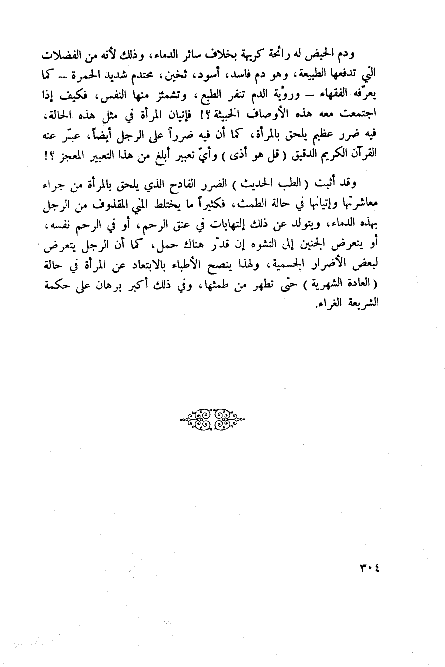 وقد أثبت (الطب الحديث) الضرر الفادح الذي يلحق بالمرأة من جراء معاشرتها وإتيانهاه في حالة الطمث، فكثيراً ما يختلط المني المقذوف من الرجل بهذه الدماء، ويتولد عن ذلك إلتهابات في عنق الرحم، أو في الرحم نفسه، أو يتعرض الجنين إلى التشوه إن قدّر هناك حمل، كما أن الرجل يتعرض لبعض الأضرار الجسمية، ولهذا ينصح الأطباء بالابتعاد عن المرأة في حالة (العادة الشهرية) حتى تطهر من طمثها، وفي ذلك أكبر برهان على حكمة الشريعة الغراء.