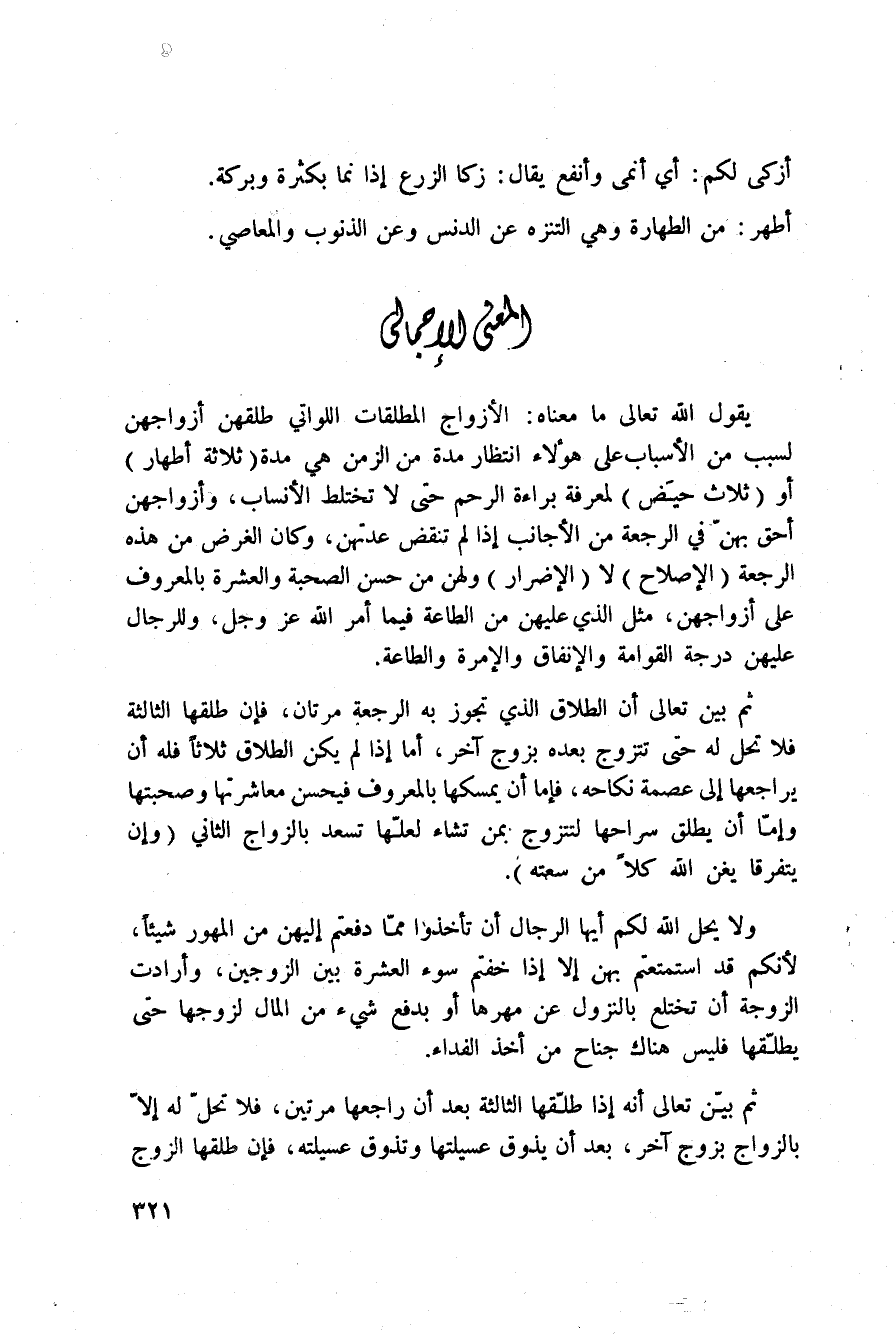 ولا يحل الله لكم أيها الرجال أن تأخذوا ممّا دفعتم إليهن من المهور شيئاً، لأنكم قد استمتعتم بهن إلا إذا خفتم سوء العشرة بين الزوجين، وأرادت الزوجة أن تختلع بالنزول عن مهرها أو بدفع شيء من المال لزوجها حتى يطلّقها فليس هناك جناح من أخذ الفداء.