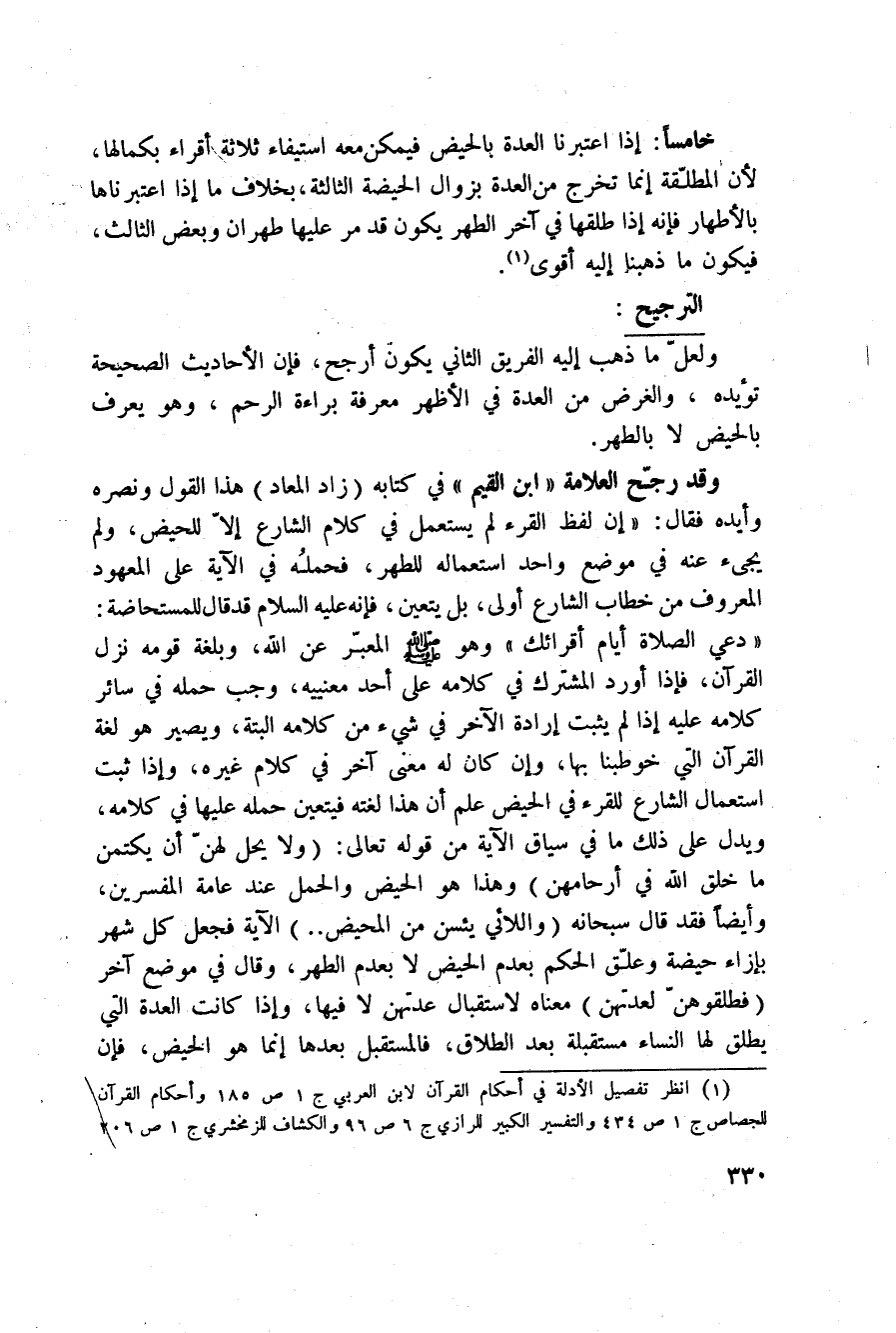 وقد رجّح العلامة «ابن القيم» في كتابه «زاد المعاد» هذا القول ونصره وأيده فقال: «إن لفظ (القرء) لم يستعمل في كلام الشارع إلاّ للحيض، ولم يجيء عنه في موضع واحد استعماله للطهر، فحملُه في الآية على المعهود المعروف من خطاب الشارع أولى، بل يتعين، فإنه عليه السلام قد قال للمستحاضة:» دعي الصلاة أيام أقرائك «وهو صَلَّى اللَّهُ عَلَيْهِ وَسَلَّم َ المعبّر عن الله، وبلغه قومه نزل القرآن، فإذا أورد المشترك في كلامه على أد معنييه، وجب حمله في سائر كلامه عليه إذا لم يثبت إرادة الآخر في شيء من كلامه البتة، ويصير هو لغة القرآن التي خوطبنا بها، وإن كان له معنى آخر في كلام غيره، وإذا ثبت استعمال الشارع للقرء في الحيض علم أن هذا لغته فيتعين حمله عليها في كلامه، ويدل على ذلك ما في سياق الآية من قوله تعالى: {وَلاَ يَحِلُّ لَهُنَّ أَن يَكْتُمْنَ مَا خَلَقَ الله في أَرْحَامِهِنَّ} وهذا هو الحيض والحمل عند عامة المفسرين، وأيضاً فقد قال سبحانه: