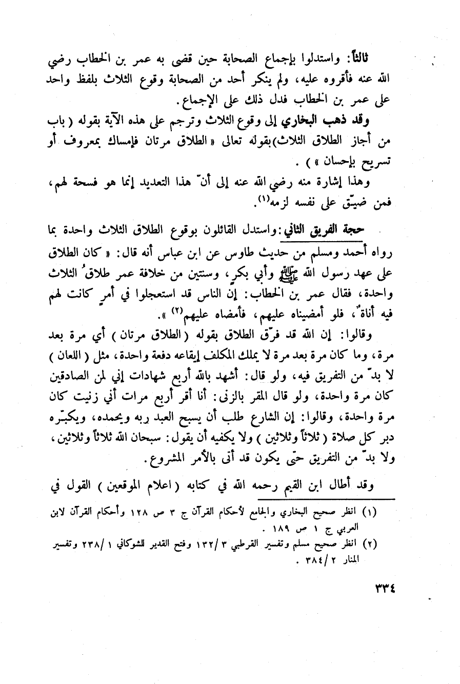 واستدل القائلون بوقوع الطلاق الثلاث واحدة بما رواه أحمد ومسلم من حديث طاووس عن ابن عباس أنه قال: «كان الطلاق على عهد رسول الله صَلَّى اللَّهُ عَلَيْهِ وَسَلَّم َ وأبي بكر، وسنتين من خلافة عمر طلاقُ الثلاث واحدة، فقال عمر بن الخطاب: إن الناس قد استعجلوا في أمرٍ كانت لهم فيه أناةٌ، فلو أمضيناه عليهم، فأمضاه عليهم» .