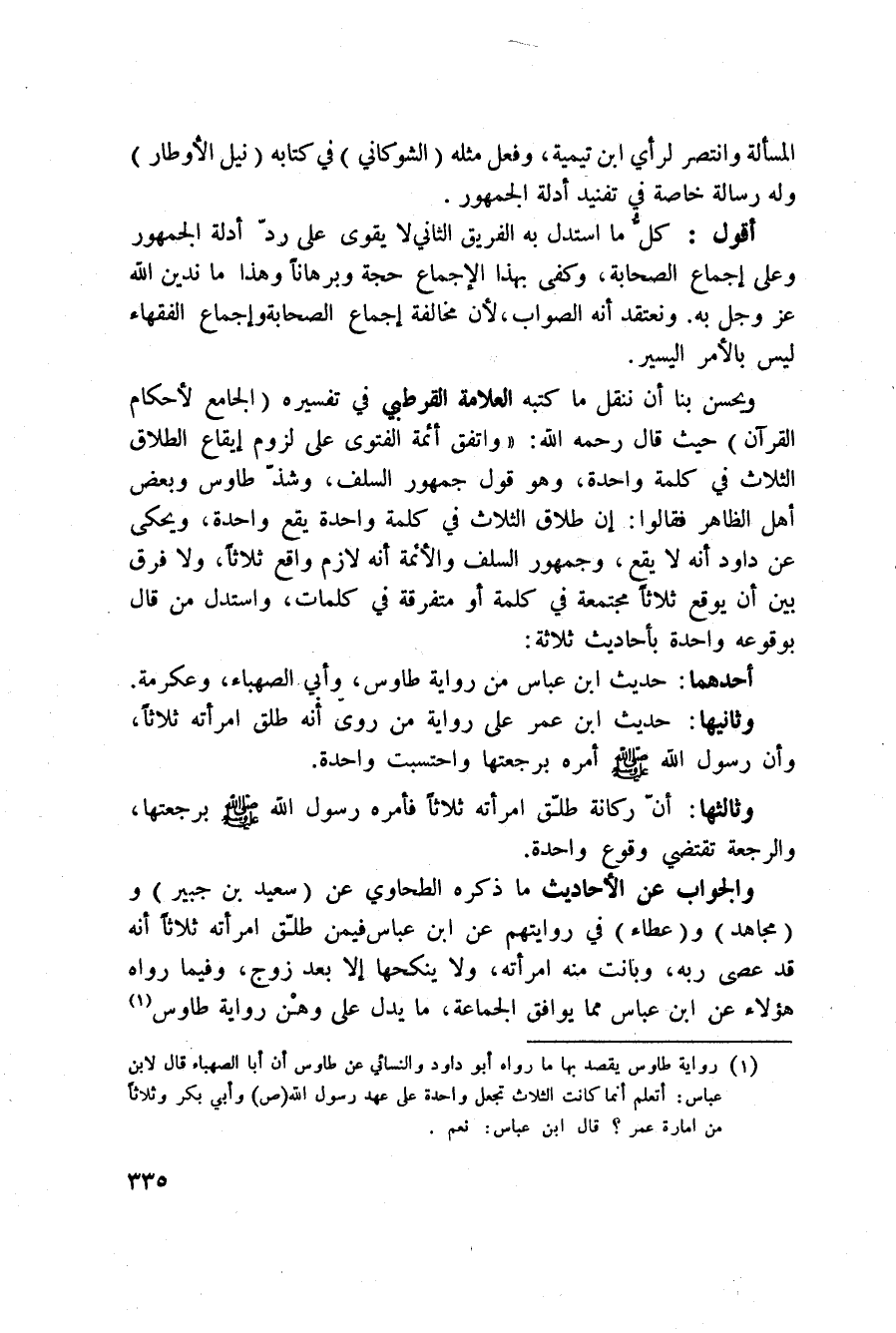 ويحسن بنا أن ننقل ما كتبه العلامة القرطبي في تفسير «الجامع لأحكام القرآن» حيث قال رَحِمَهُ اللَّهُ: «واتفق أئمة الفتوى على لزوم إيقاع الطلاق الثلاث في كلمة واحدة، وهو قول جمهور السلف، وشذّ طاوس وبعض أهل الظاهر فقالوا: إن طلاق الثلاث في كلمة واحدة يقع واحدة، ويحكى عن داود أنه لا يقع، وجمهور السلف والأئمة أنه لازم واقع ثلاثاً، ولا فرق بين أن يوقع ثلاثاً مجتمعة في كلمة أو متفرقة في كلمات، واستدل من قال بوقوعه واحدة بأحاديث ثلاثة: