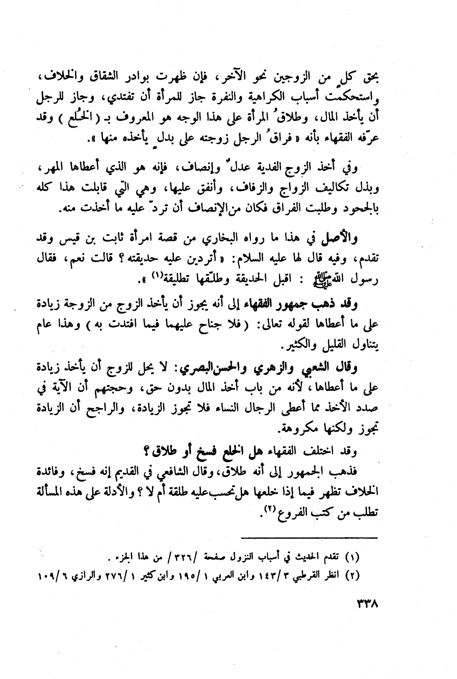 بحق كلٍ من الزوجين نحو الآخر، فإن ظهرت بوادر الشقاق والخلاف، واستحكمت أسباب الكراهية والنفرة جاز للمرأة أن تفتدي، وجاز للرجل أن يأخذ المال، وطلاقُ المرأة على هذا الوجه هو المعروف ب (الخُلع) وقد عرّفه الفقهاء بأنه» فراقُ الرجل زوجته على بدلٍ يأخذه منها «.