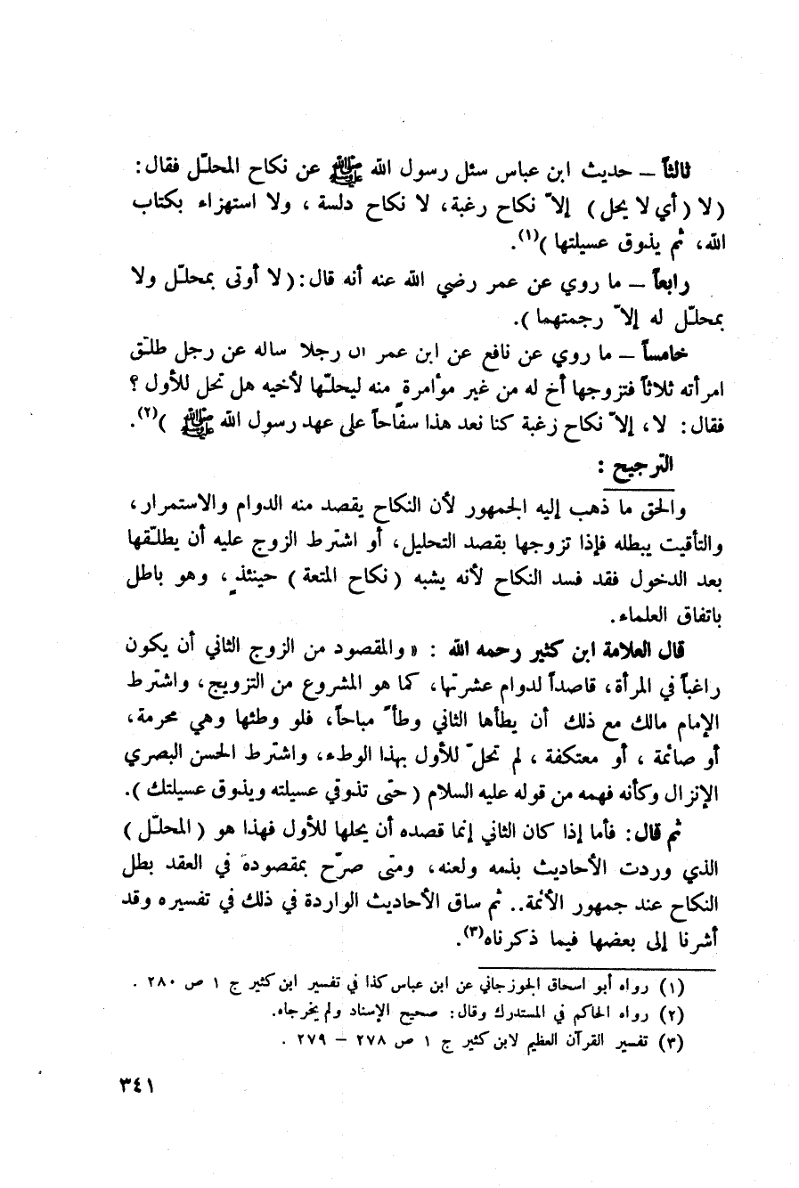 ثم قال: فأما إذا كان الثاني إنما قصده أن يحلها للأول فهذا هو (المحلّل) الذي وردت الأحاديث بذمة ولعنه، ومتى صرّح بمقصود، في العقد بطل النكاح عند جمهور الأئمة ... ثم ساق الأحاديث الواردة في ذلك في» تفسيره «وقد أشرنا إلى بعضها فيما ذكرناه» .