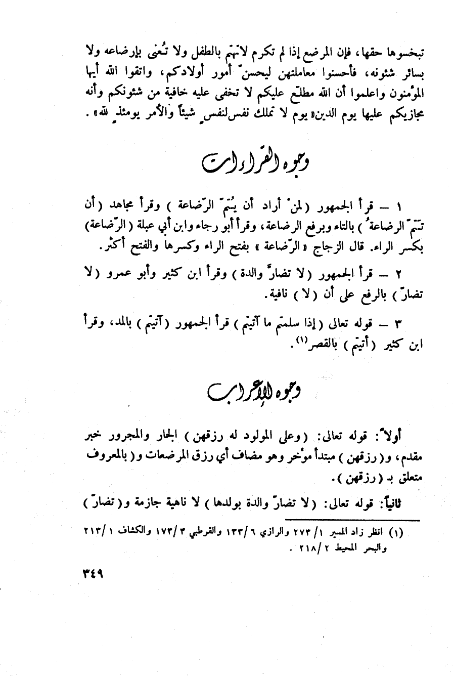 1 - قرأ الجمهور {لِمَنْ أَرَادَ أَن يُتِمَّ الرضاعة} وقرأ مجاهد (أن تَتمّ الرضاعةُ) بالتاء وبرفع الرضاعة، وقرأ أبو رجاء وابن أبي عبلة (الرّضاعة) بكسر الراء. قال الزجاج «الرّضاعة» بفتح الراء وكسرها والفتح أكثر.