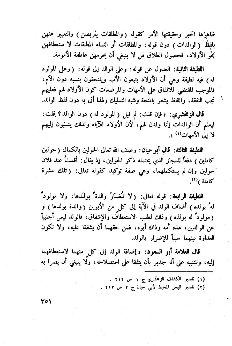 اللطيفة الرابعة: قوله تعالى: {لاَ تُضَآرَّ وَالِدَةٌ بِوَلَدِهَا وَلاَ مَوْلُودٌ لَّهُ بِوَلَدِهِ} أضاف الولد في الآية إلى كل من الأبوين {وَالِدَةٌ بِوَلَدِهَا} و {وَلاَ مَوْلُودٌ لَّهُ بِوَلَدِهِ} وذلك لطلب الاستعطاف والإشفاق، فالولد ليس أجنبياً عن الوالدين، هذه أمه وذاك أبوه، فمن حقهما أن يشفقا عليه، ولا تكون العداوة بينهما سبباً للإضرار بالولد.