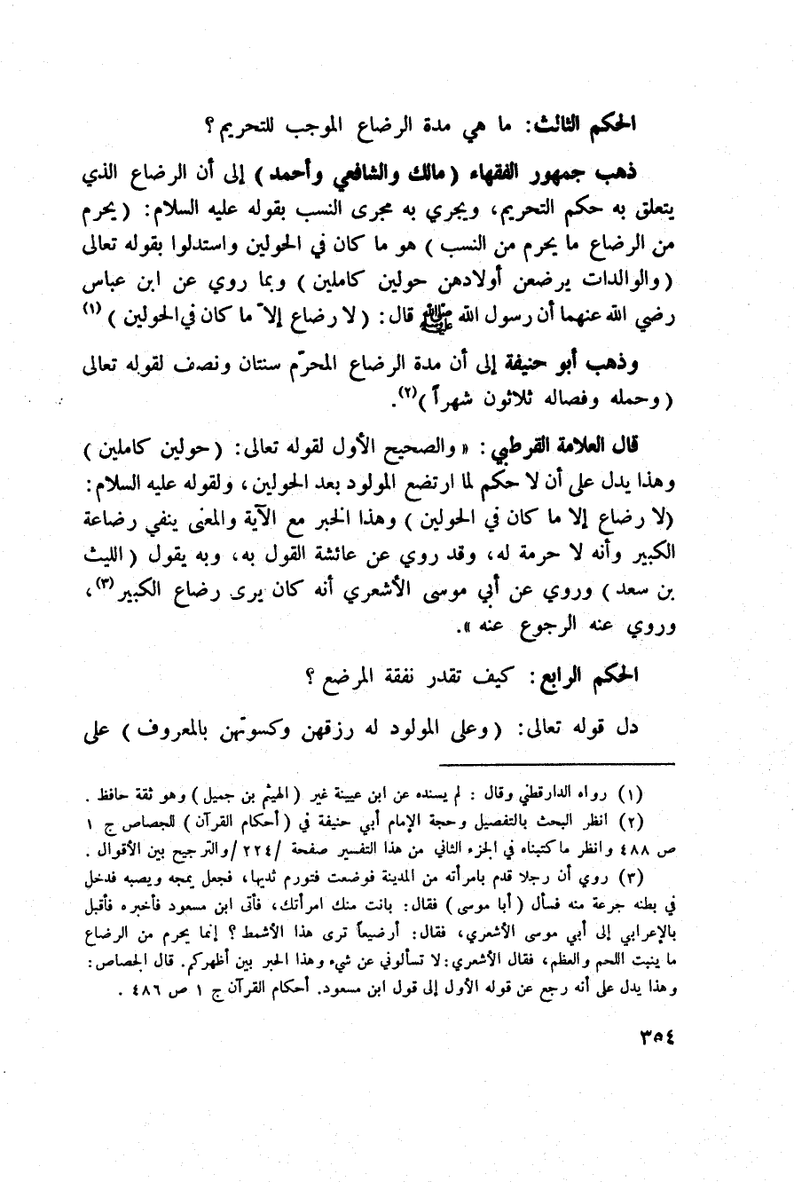 قال العلامة القرطبي: «والصحيح الأول لقوله تعالى: {حَوْلَيْنِ كَامِلَيْنِ} وهذا يدل على أن لا حكم لما ارتضع المولود بعد الحولين، ولقوله عليه السلام:» لا رضاع إلا ما كان في الحولين «وهذا الخبر مع الآية والمعنى ينفي رضاعة الكبير وأنه لا حرمة له، وقد روي عن عائشة القول به، وبه يقول: (الليث بن سعد) وروي عن أبي موسى الأشعري أنه كان يرى رضاع الكبير، وروي عنه الرجوع عنه» .