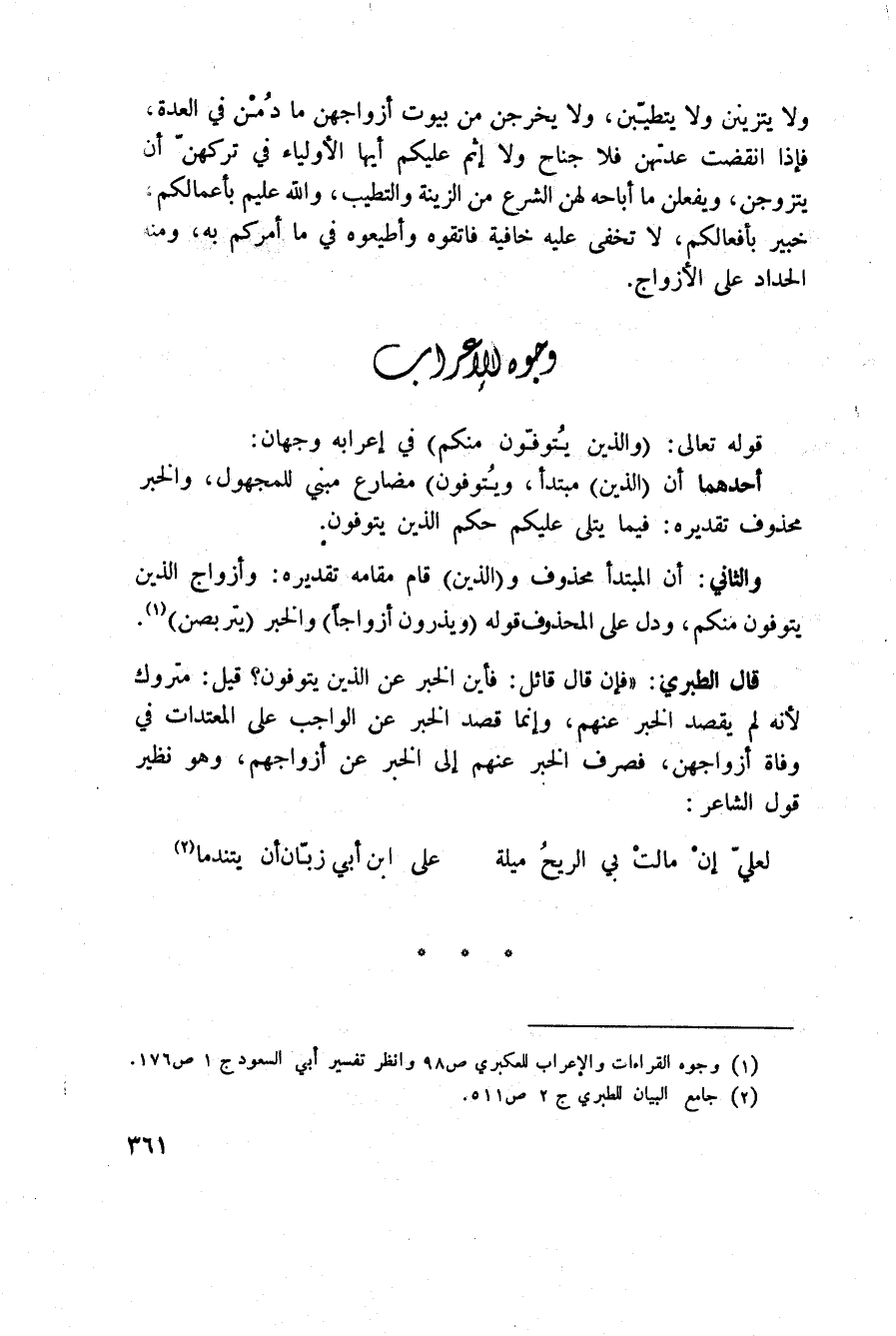 قال الطبري: «فإن قال قائل: فأين الخبر عن الذين يتوفون؟ قيل: متروك لأنه لم يقصد الخبر عنهم، وإنما قصد الخبر عن الواجب على المعتدات في وفاة أزواجهن، فصرف الخبر عنهم إلى الخبر عن أزواجهم، وهو نظير قول الشاعر: