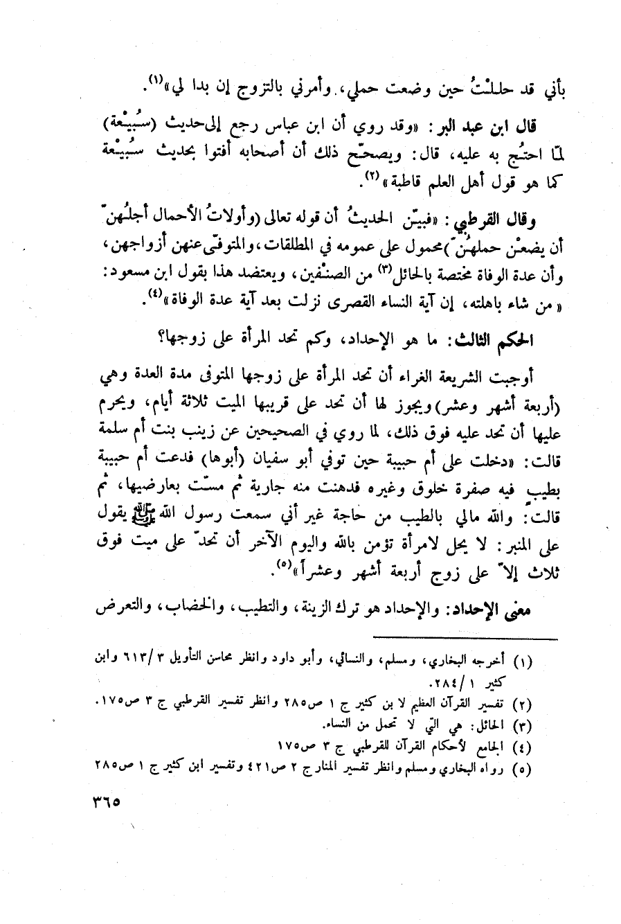 وقال القرطبي:» فبيّن الحديثُ أن قوله تعالى: {وَأُوْلاَتُ الأحمال أَجَلُهُنَّ أَن يَضَعْنَ حَمْلَهُنَّ} [الطلاق: 4] محمول على عمومه في المطلقات، والمتوفّى عنهن أزواجهن، وأن عدة الوفاة مختصة بالحائل من الصنْفين، ويعتضد هذا بقول ابن مسعود: «من شاء باهلته، إن آية النساء القصرى نزلت بعد آية عدة الوفاة» .