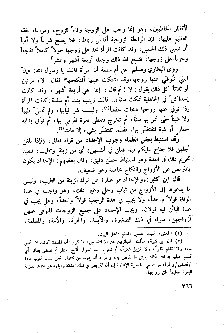روى البخاري ومسلم «عن أم سلمة أن امرأة قالت يا رسول الله:» إنّ ابنتي تُوفّي عنها زوجها، وقد اشتكت عينها أفنكحلها؟ فقال: لا، مرتين أو ثلاثاً كل ذلك يقول: لا! ثم قال: إنما هي أربعة أشهر، وقد كانت إحداكنّ في الجاهلية تمكث سنة «قالت زينب بنت أم سلمة: كانت المرأة إذا توفي عنها زوجها دخلت حفشاً، ولبست شر ثيابها، ولم تمسّ طيباً ولا شيئاً حتى تمر بها سنة، ثم تخرج فتعطى بعرة فترمي بها، ثم تؤتى بدابة حمارٍ أو شاة فتفتضّ بها، فقلما تفتضّ بشيء إلا مات.