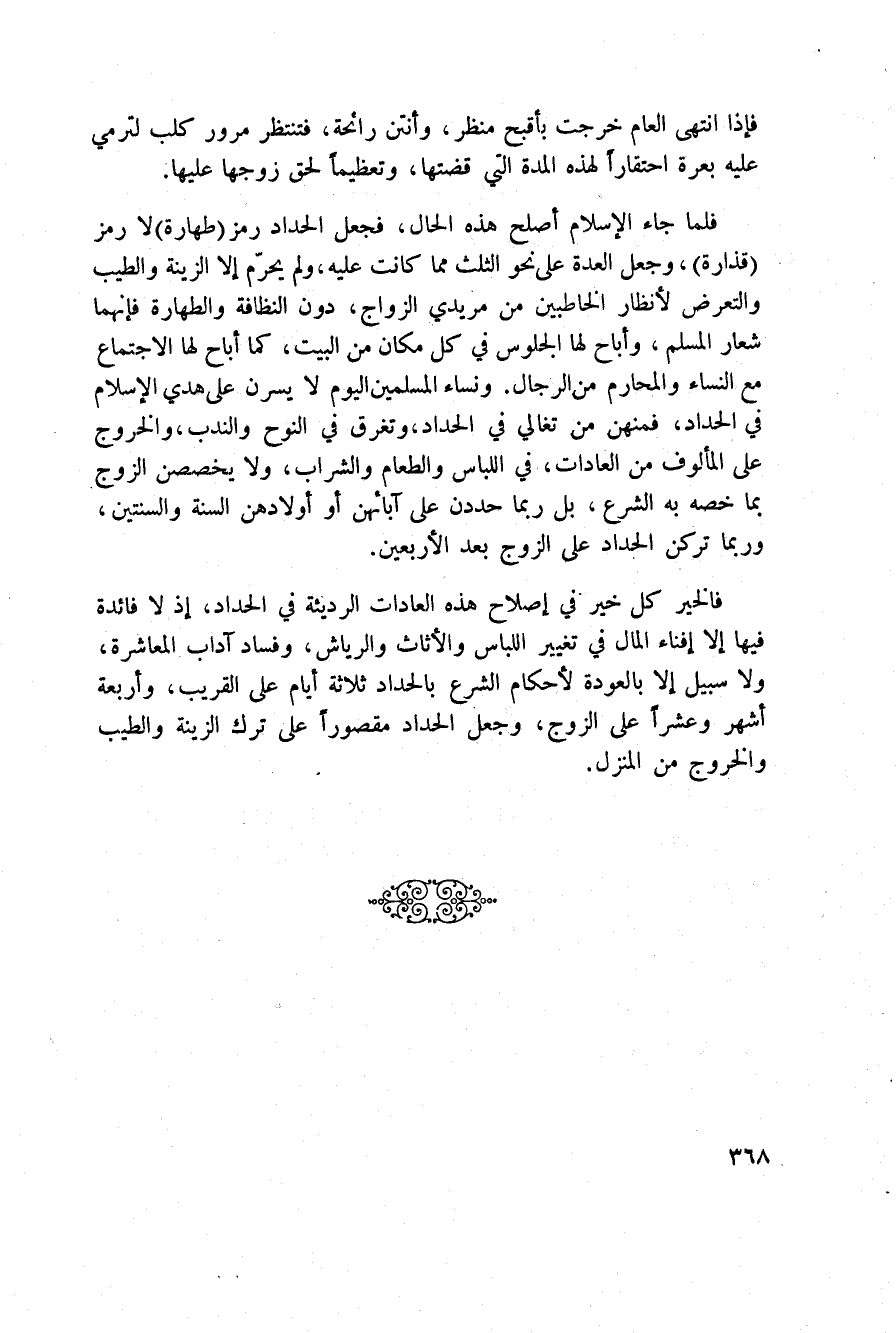 فالخير كل خير في إصلاح هذه العادات الرديئة في الحداد، إذ لا فائدة فيها إلاّ إفناء المال في تغيير اللباس والأثاث والرياش، وفساد آداب المعاشرة، ولا سبيل إلاّ بالعودة لأحكام الشرع بالحداد ثلاثة أيام على القريب، وأربعة أشهر وعشراً على الزوج، وجعل الحداد مقصوراً على ترك الزينة والطيب والخروج من المنزل.