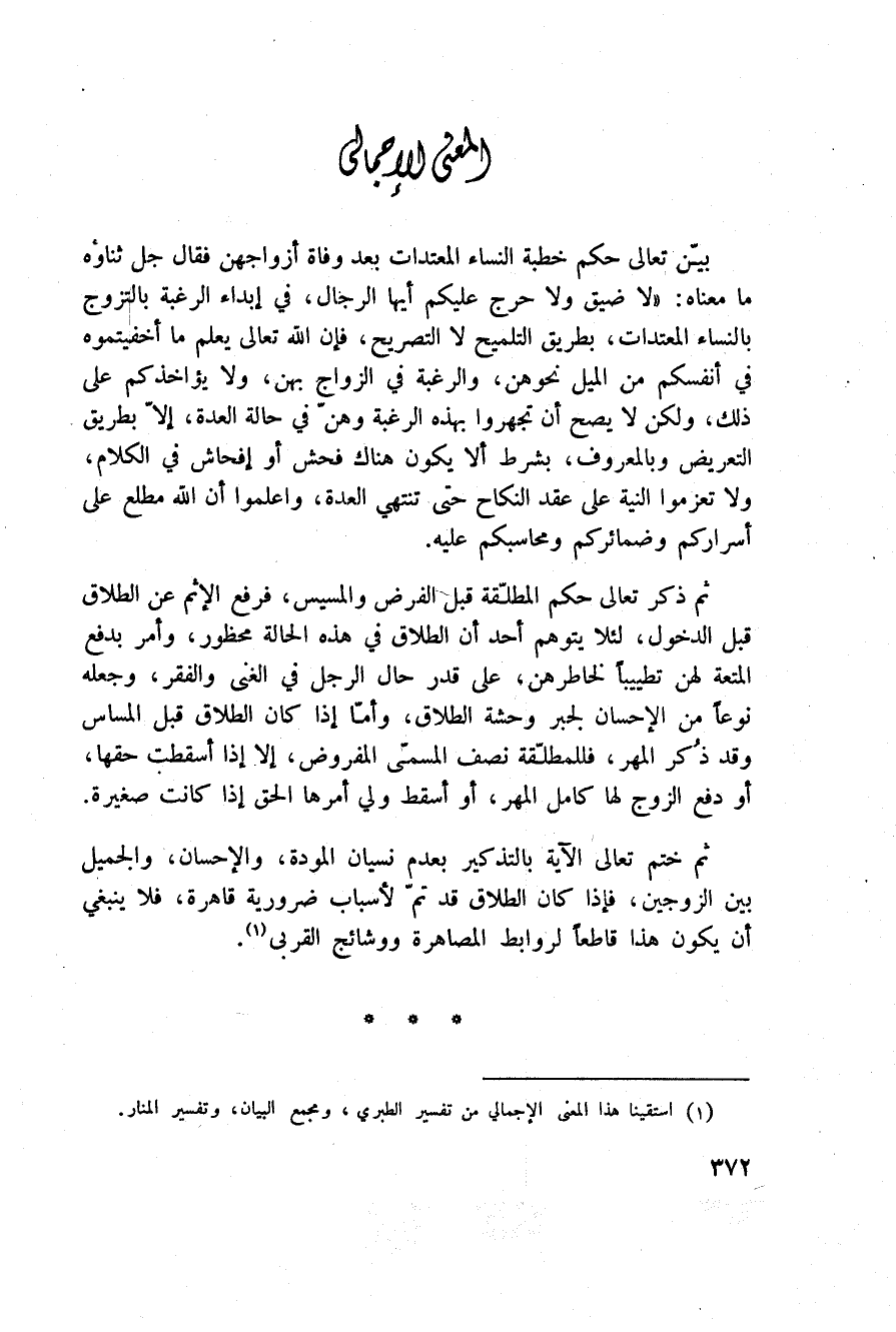 بيّن تعالى حكم خطبة النساء المعتدات بعد وفاة أزواجهن فقال جل ثناؤه ما معناه: «لا ضيق ولا حرج عليكم أيها الرجال، في إبداء الرغبة بالتزوج بالنساء المعتدات، بطريق التلميح لا التصريح، فإن الله تعالى يعلم ما أخفيتموه في أنفسكم من الميل نحوهن، والرغبة في الزواج بهن، ولا يؤاخذكم على ذلك، ولكن لا يصح أن تجهروا بهذه الرغبة وهنّ في حالة العدة، إلاّ بطريق التعريض وبالمعروف، بشرط ألاّ يكون هناك فحش أو إفحاش في الكلام، ولا تعزموا النية على عقد النكاح حتى تنتهي العدة، واعلموا أن الله مطلع على أسراركم وضمائركم ومحاسبكم عليه.