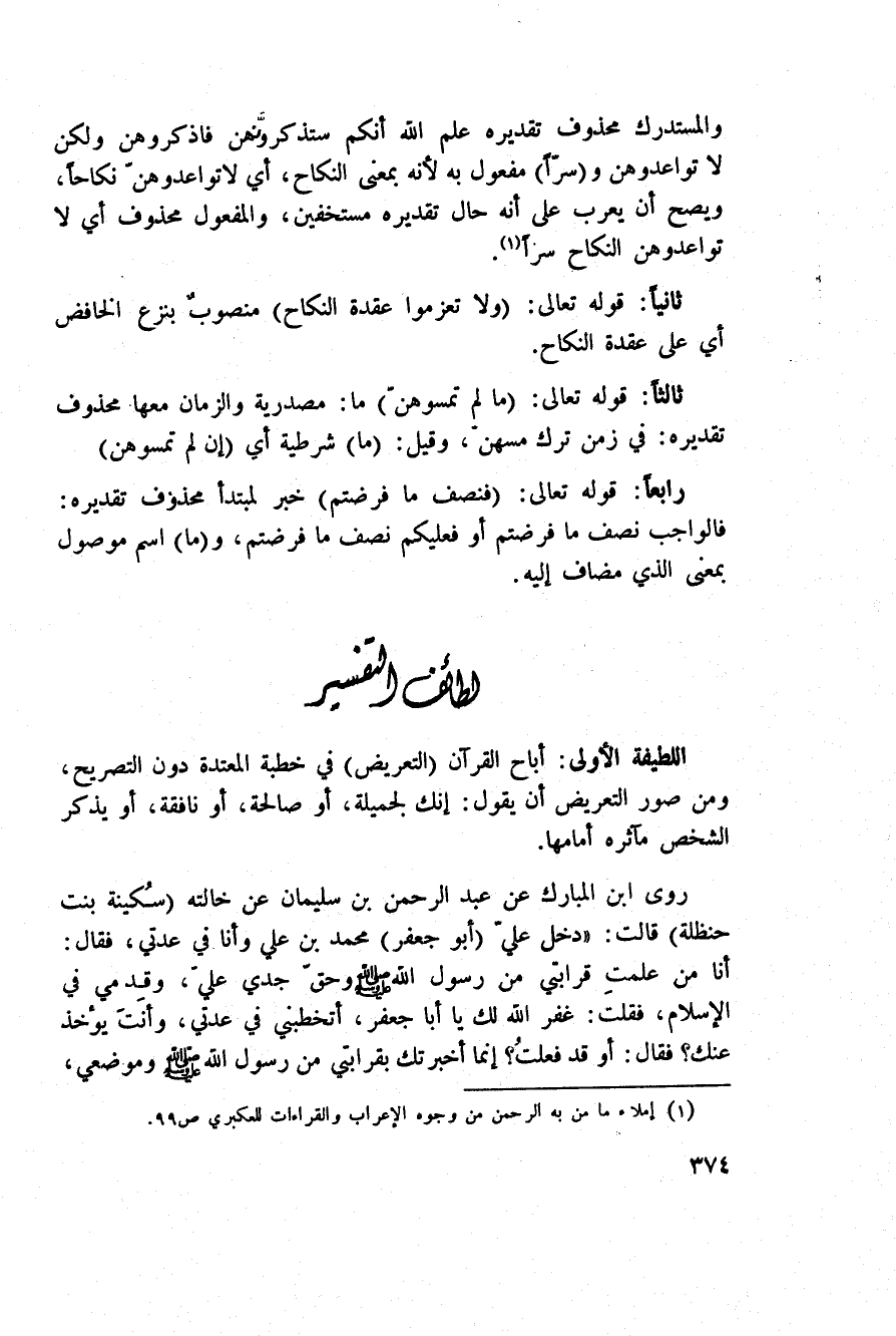 اللطيفة الأولى: أباح القرآن (التعريض) في خطبة المعتدة دون التصريح، ومن صور التعريض أن يقول: إنك لجميلة، أو صالحة، أو نافقة، أو يذكر الشخص مآثره أمامها.