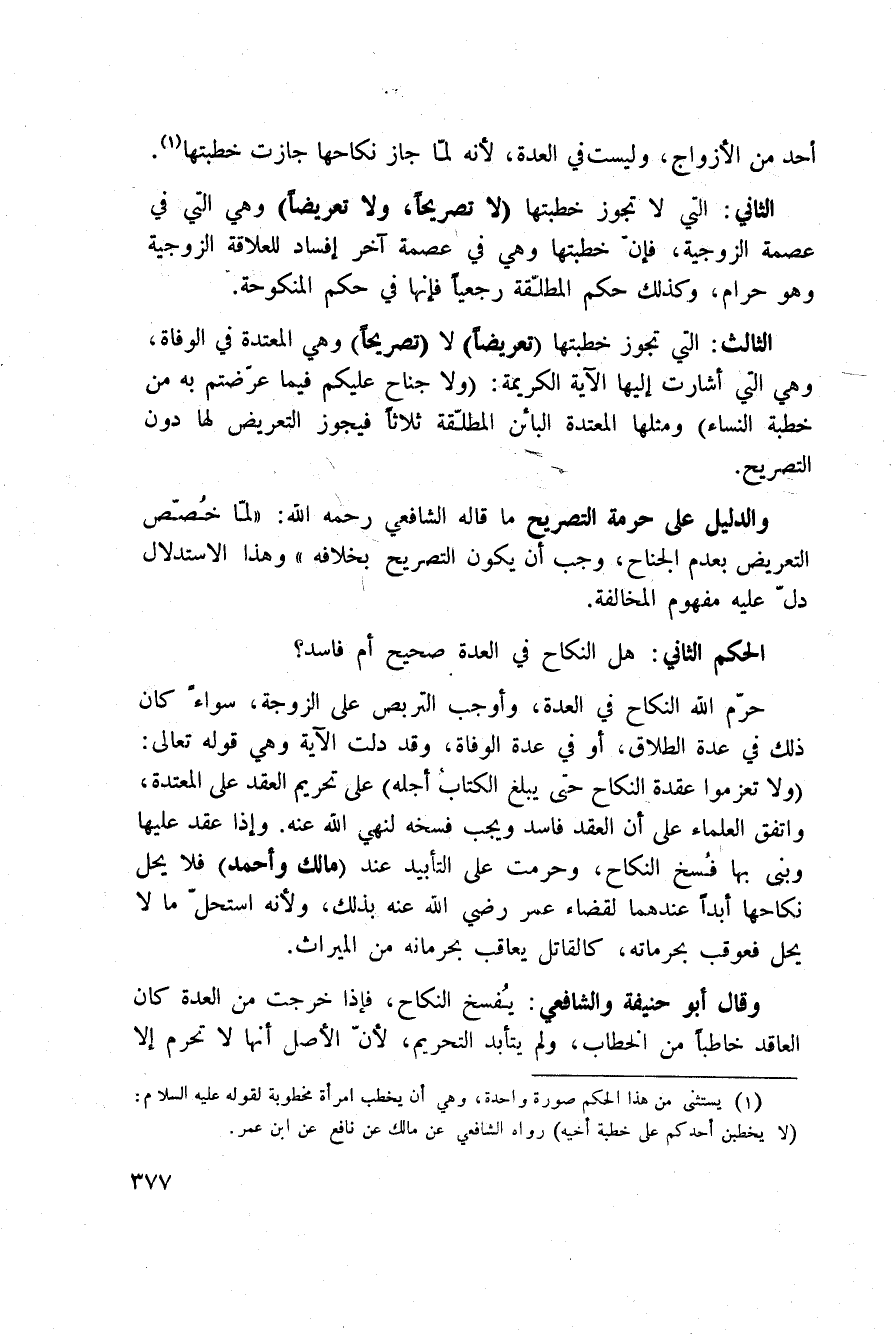 الثالث: التي تجوز خطبتها (تعريضاً) لا (تصريحاً) وهي المعتدة في الوفاة، وهي التي أشارت إليها الآية الكريمة: {وَلاَ جُنَاحَ عَلَيْكُمْ فِيمَا عَرَّضْتُمْ بِهِ مِنْ خِطْبَةِ النسآء} ومثلها المعتدة البائن المطلّقة ثلاثاً فيجوز التعريض لها دون التصريح.
