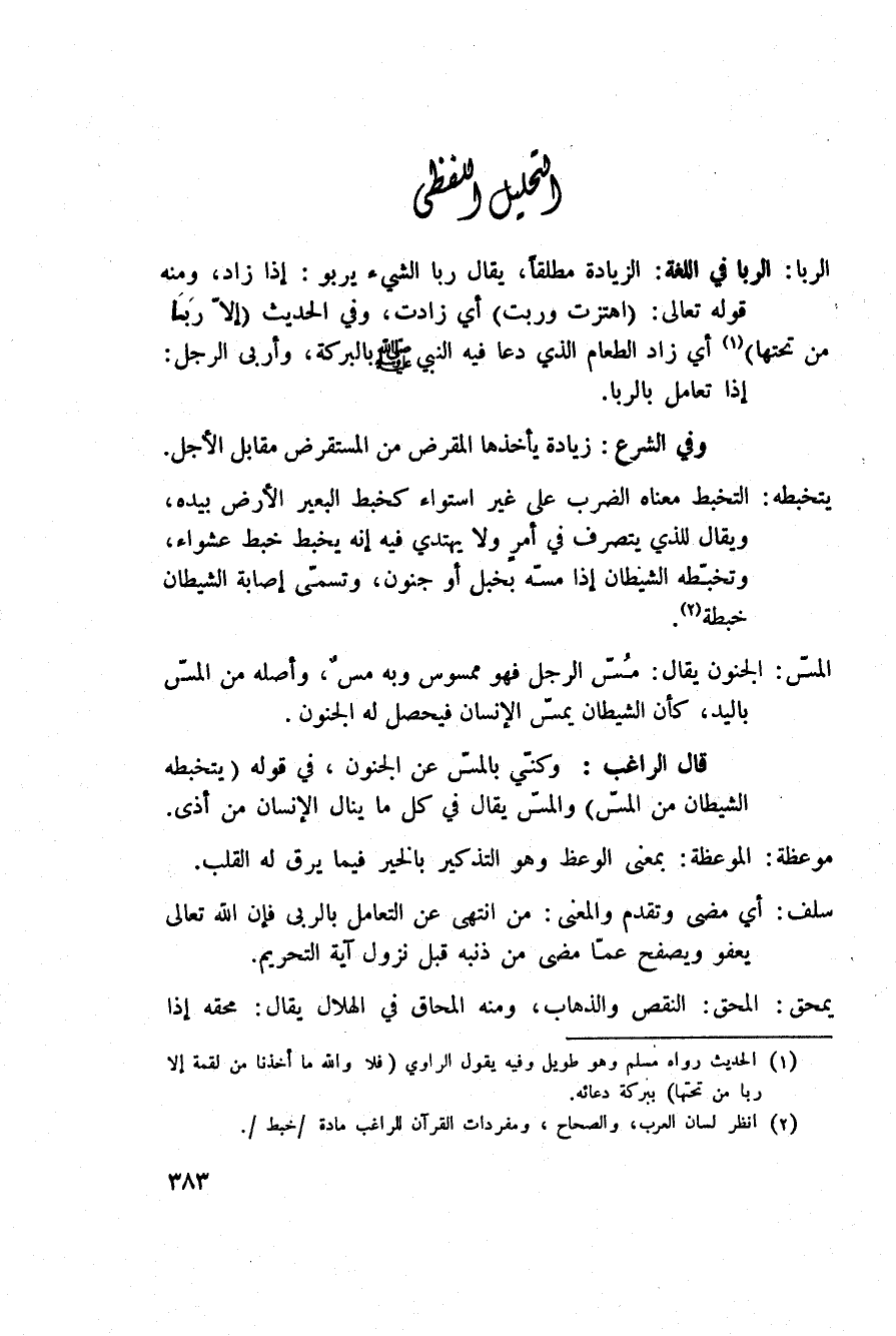 {الرباوا} : الربا في اللغة: الزيادة مطلقاً، يقال ربا الشيء يربو: إذا زاد، ومنه قوله تعالى: {اهتزت وَرَبَتْ} [الحج: 5] أي زادت، وفي الحديث «إلاّ رَبَا من تحتها» أي زاد الطعام الذي دعا فيه النبي صَلَّى اللَّهُ عَلَيْهِ وَسَلَّم َ بالبركة، وأربى الرجل: إذا تعامل بالربا.