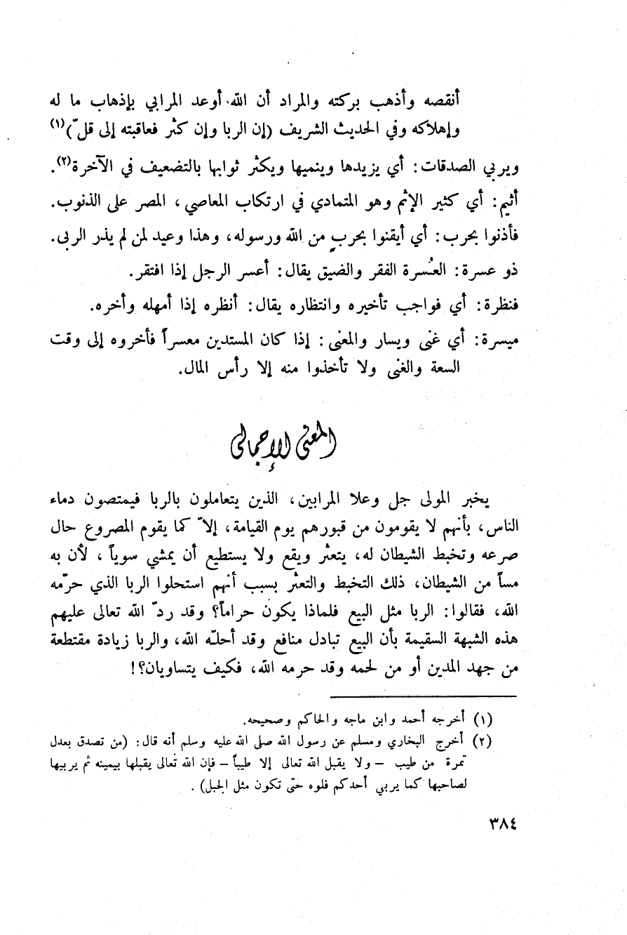 يخبر الولي جل وعلا المرابين، الذي يتعاملون بالربا فيمتصون دماء الناس، بأنهم لا يقومون من قبورهم يوم القيامة، إلاّ كما يقوم المصروع حال صرعه وتخبط الشيطان له، يتعثر ويقع ولا يستطيع أن يمشي سوياً، لأن به مساً من الشيطان، ذلك التخبط والتعثر بسبب أنهم استحلوا الربا الذي حرّمه الله، فقالوا: الربا مثل البيع فلماذا يكون حراماً؟ وقد ردّ الله تعالى عليهم هذه الشبهة السقيمة بأن البيع تبادل منافع وقد أحلّه الله، والربا زيادة مقتطعة من جهد المدين أو من لحمه وقد حرمه الله، فكيف يتساويان؟!