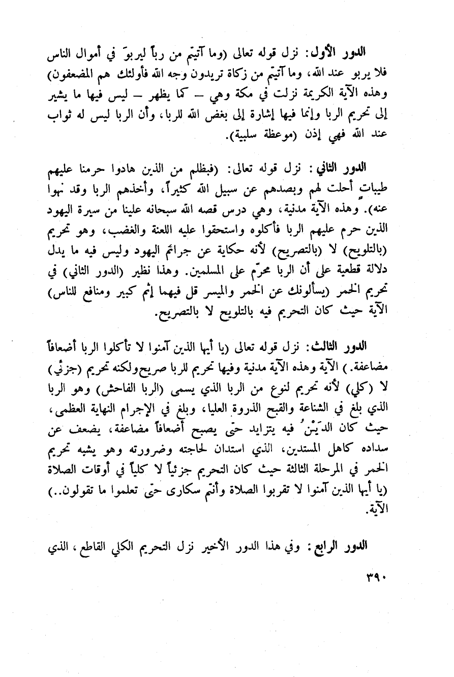 الدور الثالث: نزل قوله تعالى: {ياأيها الذين آمَنُواْ لاَ تَأْكُلُواْ الرباوا أضعافا مضاعفة} [آل عمران: 130] . الآية وهذه الآية مدنية وفيها تحريم للربا صريح ولكنه تحريم (جزئي) لا (كلي) لأنه تحريم لنوع من الربا الذي يسمى (الربا الفاحش) وهو الربا الذي بلغ في الشناعة والقبح الذرة العليا، وبلغ في الإجرام النهاية العظمى، حيث كان الدَيْنُ فيه يتزايد حتى يصبح أضعافاً مضاعفة، يضعف عن سداده كاهل المستدين، الذي استدان لحاجته وضرورته وهو يشبه تحريم الخمر في المرحلة الثالثة حيث كان التحريم جزئياً لا كلياً في أوقات الصلاة