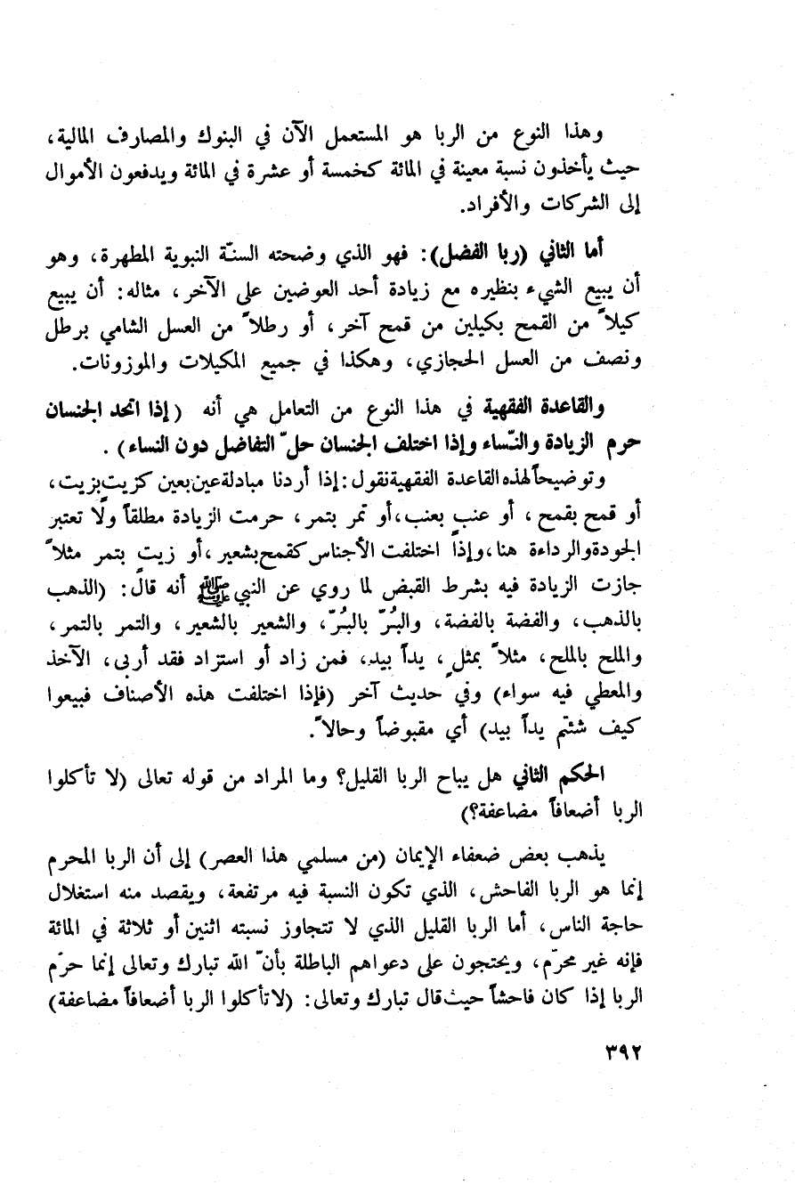أما الثاني (ربا الفضل) : فهو الذي وضحته السنّة النبوية المطهرة، وهو أن يبيع الشيء بنظيره مع زيادة أحد العوضين على الآخر، مثاله: أن يبيع كيلاً من القمح بكيلين من قمح آخر، أو رطلاً من العسل الشامي برطل ونصف من العسل الحجازي، وهكذا في جميع المكيلات والموزونات.