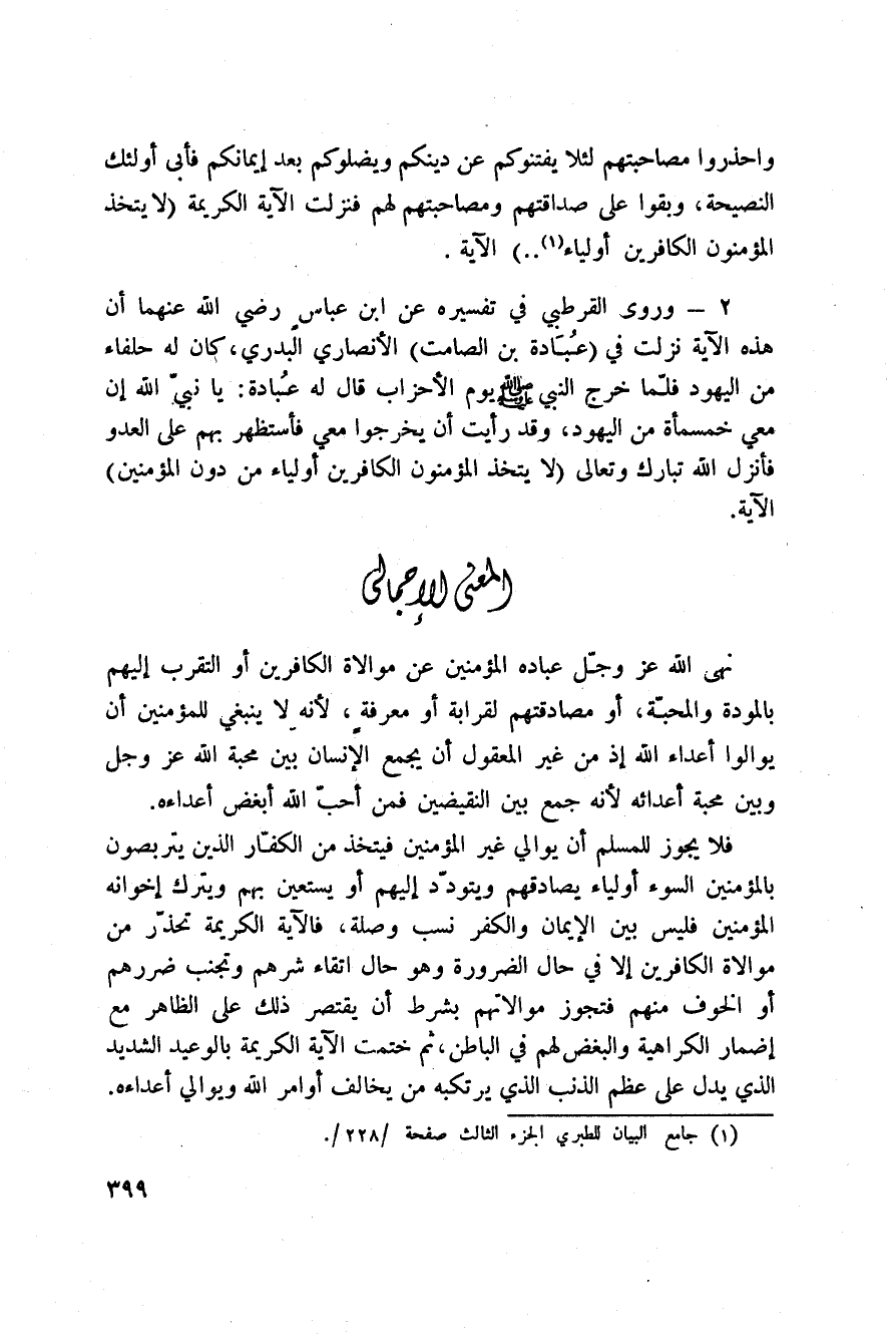 2 - وروى القرطبي في «تفسيره» عن ابن عباسٍ رَضِيَ اللَّهُ عَنْهما أن هذه الآية نزلت في (عُبَادة بن الصامت) الأنصاري البدري، كان له حلفاء من اليهود فلّما خرج النبي صَلَّى اللَّهُ عَلَيْهِ وَسَلَّم َ يوم الأحزاب قال له عُبادة: يا نبيّ الله إن معي خمسمائة من اليهود، وقد رأيت أن يخرجوا معي فأستظهر بهم على العدو، فأنزل الله تبارك وتعالى: {لاَّ يَتَّخِذِ المؤمنون الكافرين أَوْلِيَآءَ مِن دُونِ المؤمنين} الآية.