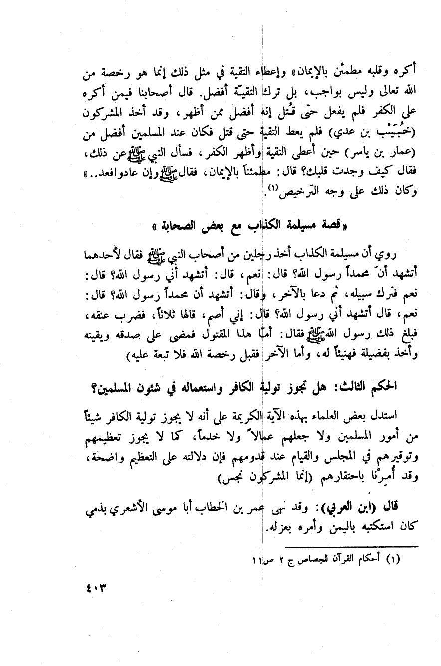 أُكْرِهَ وَقَلْبُهُ مُطْمَئِنٌّ بالإيمان} [النحل: 106] وإعطاء التقية في مثل ذلك إنما هو رخصة من الله تعالى وليس بواجب، بل ترك التقيّة أفضل. قال أصحابنا فيمن أكره على الكفر فلم يفعل حتى قُتل إنه أفضل ممن أظهر، وقد أخذ المشركون (خُبَيْب بن عدي) فلم يعط التقية حتى قتل فكان عند المسلمين أفضل من (عمار بن ياسر) حين أعطى التقية وأظهر الكفر، فسأل النبي صَلَّى اللَّهُ عَلَيْهِ وَسَلَّم َ عن ذلك، فقال كيف وجدت قلبك؟ قال: مطئمناً بالإيمان، فقال صَلَّى اللَّهُ عَلَيْهِ وَسَلَّم َ» وإن عادوا فعد ... «. وكان ذلك على وجه الترخيص.