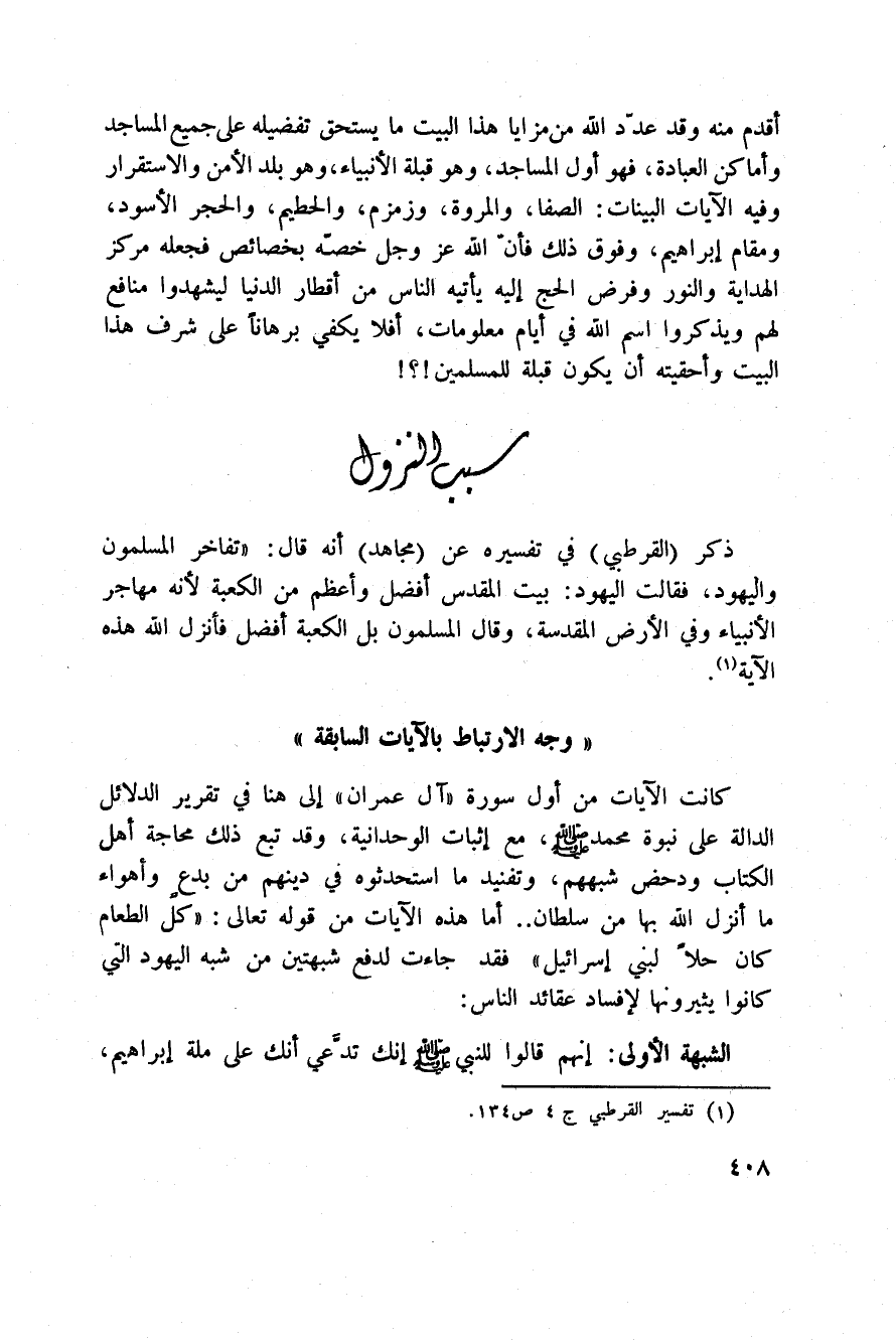 كانت الآيات من أول سور «آل عمران» إلى هنا في تقرير الدلائل الدالة على نبوة محمد صَلَّى اللَّهُ عَلَيْهِ وَسَلَّم َ مع إثبات الوحدانية، وقد تبع ذلك محاجة أهل الكتاب ودحض شبههم، وتفنيد ما استحدثوه في دينهم من بدعٍ وأهواء ما أنزل الله بها من سلطان. . أما هذه الآيات من قوله تعالى: {كُلُّ الطعام كَانَ حِلاًّ لبني إِسْرَائِيلَ إِلاَّ مَا حَرَّمَ إِسْرَائِيلُ} [آل عمران: 93] فقد جاءت لدفع شبهتين من شبه اليهود التي كانوا يثيرونها لإفساد عقائد الناس.