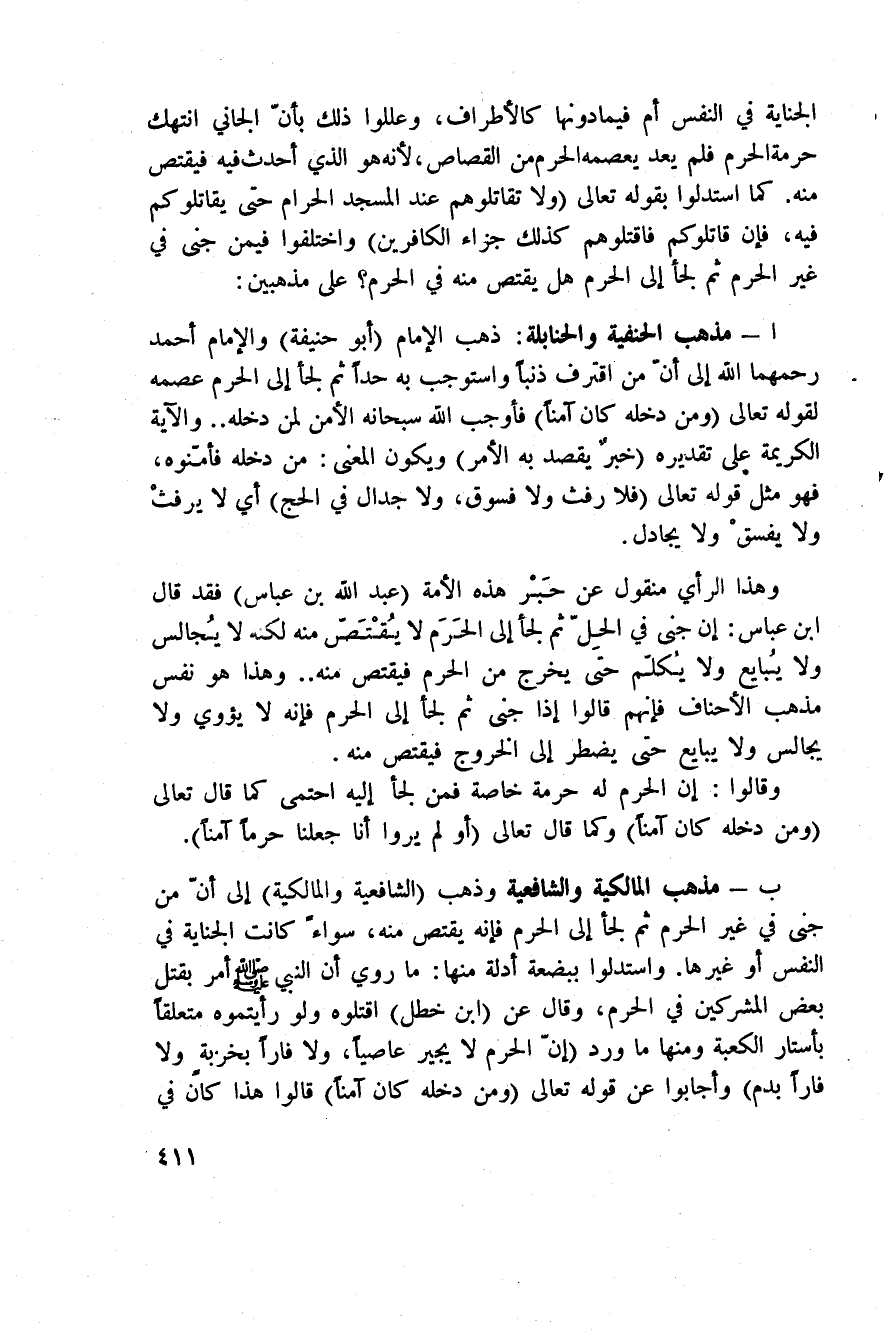 ب - مذهب المالكية والشافعية: وذهب (الشافعية والمالكية) إلى أنّ من جنى في غير الحرم ثم لجأ إلى الحرم فإنه يقتص منه، سواءَ كانت الجناية في النفس أو غيرها. واستدلوا ببضعة أدلة منها: ما روي أن النبي صَلَّى اللَّهُ عَلَيْهِ وَسَلَّم َ أمر بقتل بعض المشركين في الحرم، وقال عن (ابن خطل) اقتلوه ولو رأيتموه متعلقاً بأستار الكعبة ومنها ما ورد (إنّ الحرم لا يجير عاصياً، ولا فاراً بخربة ولا فاراً بدم) وأجابوا على قوله تعالى: {وَمَن دَخَلَهُ كَانَ آمِناً} قالوا هذا كان في