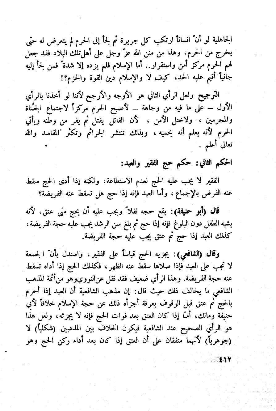 وقال (الشافعي) : يجزيه الحج قياساً على الفقير، واستدل بأنّ الجمعة لا تجب على فإذا صلاها سقط عنه الظهر، فكذلك الحج إذا أداه تسقط عنه حجة الفريضة، وهذا الرأي ضعيف فقد نقل عن النووي وهو من أئمة المذهب الشافعي ما يخالف ذلك حيث قال: إن مذهب الشافعية أن العبد إذا أحرم بالحج ثم عتق قبل الوقوف بعرفة أجزأه ذلك عن حجة الإسلام خلافاً لأبي حنيفة ومالك، أمّا إذا كان العتق بعد فوات الحج فإنه لا يجزئه، ولعل هذا هو الرأي الصحيح عند الشافعية فيكون الخلاف بين المذهبين (شكلياً) لا (جوهرياً) لأنهما متفقان على أن العتق إذا كان بعد أداء ركن وهو الوقوف بعرفة أجزأه ذلك عن حجة الإسلام خلافاً لأبي حنيفة ومالك، أمّا إذا كان العتق بعد فوات الحج فإنه لا يجزئه، ولعله هذا هو الرأي الصحيح عند الشافعية فيكون الخلاف بين المذهبين (شكلياً) لا (جوهرياً) لأنهما متفقان على أن العتق إذا كان بعد أداء ركن الحج