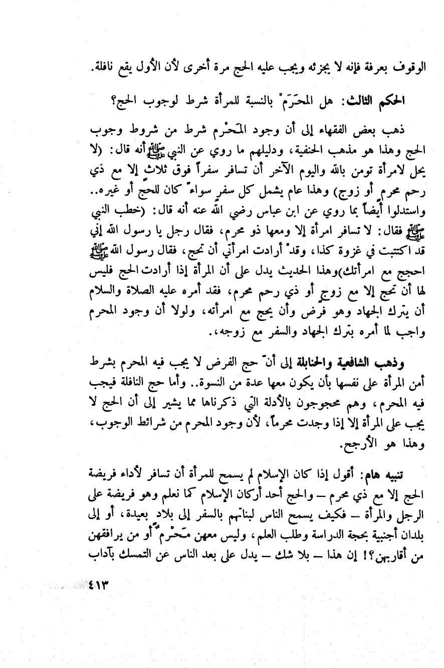 تنبيه هام: أقول إذا كان الإسلام لم يسمح للمرأة أن تسافر لأداء فريضة الحج إلا مع ذي محرم - والحج أحد أركان الإسلام كما نعلم وهو فريضة على الرجل والمرأة - فكيف يسمح الناس لبناتهم بالسفر إلى بلاد بعيدة، أو إلى بلدان أجنبية بحجة الدراسة وطلب العلم، وليس معهن مَحْرمٌ أو من يوافقهن من أقاربهن؟! إن هذا - بلا شك - يدل على بعد الناس عن التمسك بآداب