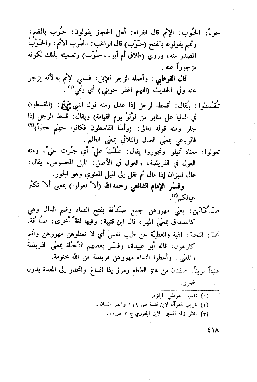{حُوباً} : الحُوب: الإثم قال الفراء: أهل الحجاز يقولون: حُوب بالضم، وتميم يقولونه بالفتح (حَوْب) قال الراغب: الحُوب الإثم، والحَوْبُ المصدر منه، وروي (طلاق أم أيوب حُوْب) وتسميته بذلك لكونه مزجوراً عنه.